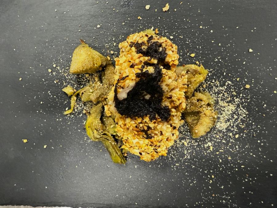 Petto di faraona  croccante in manto di nocciole con Raschera dop su carciofi sabbiosi saltati