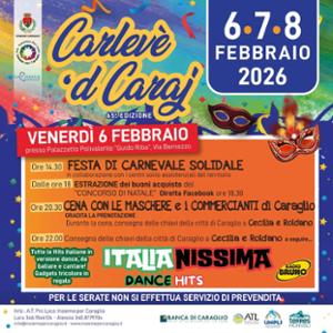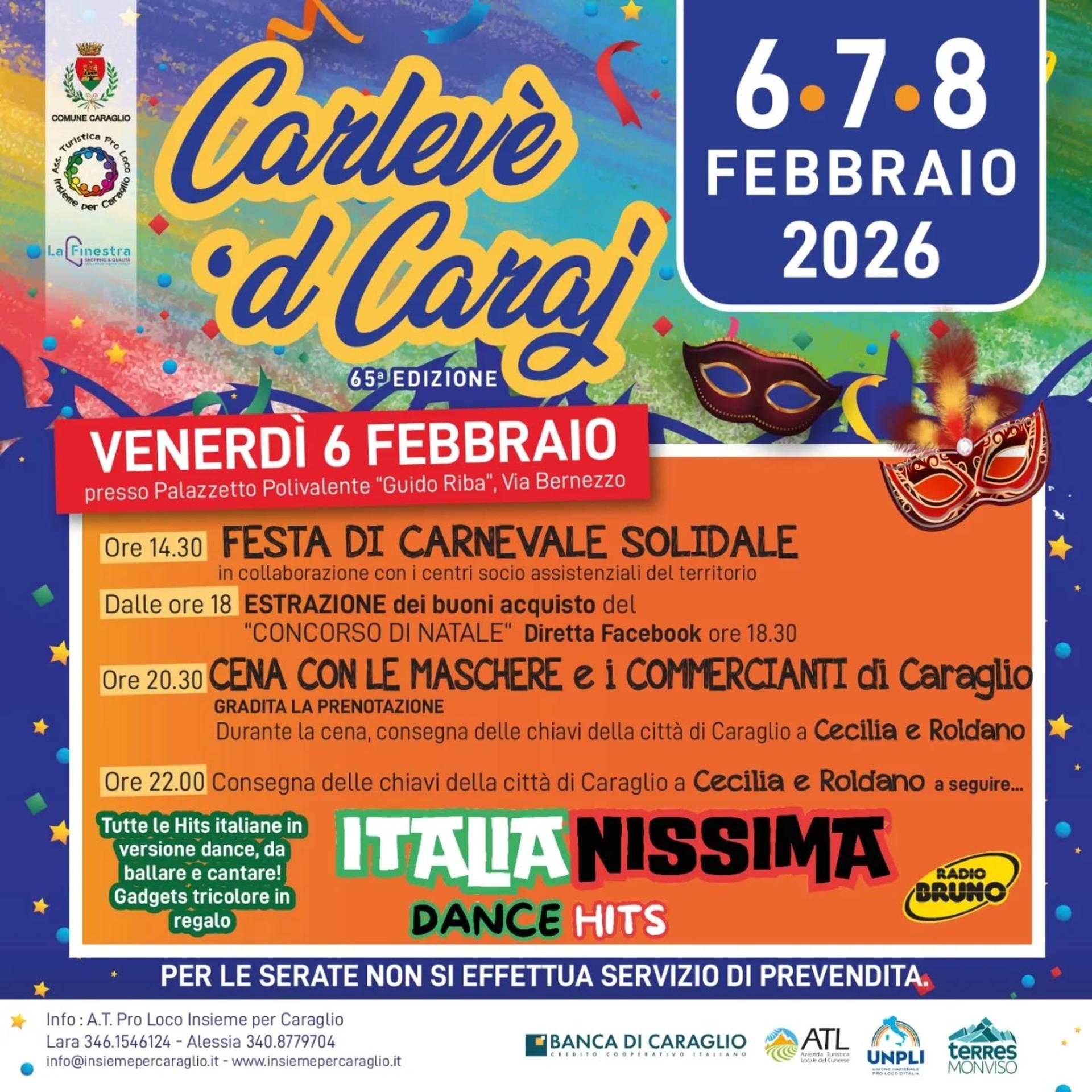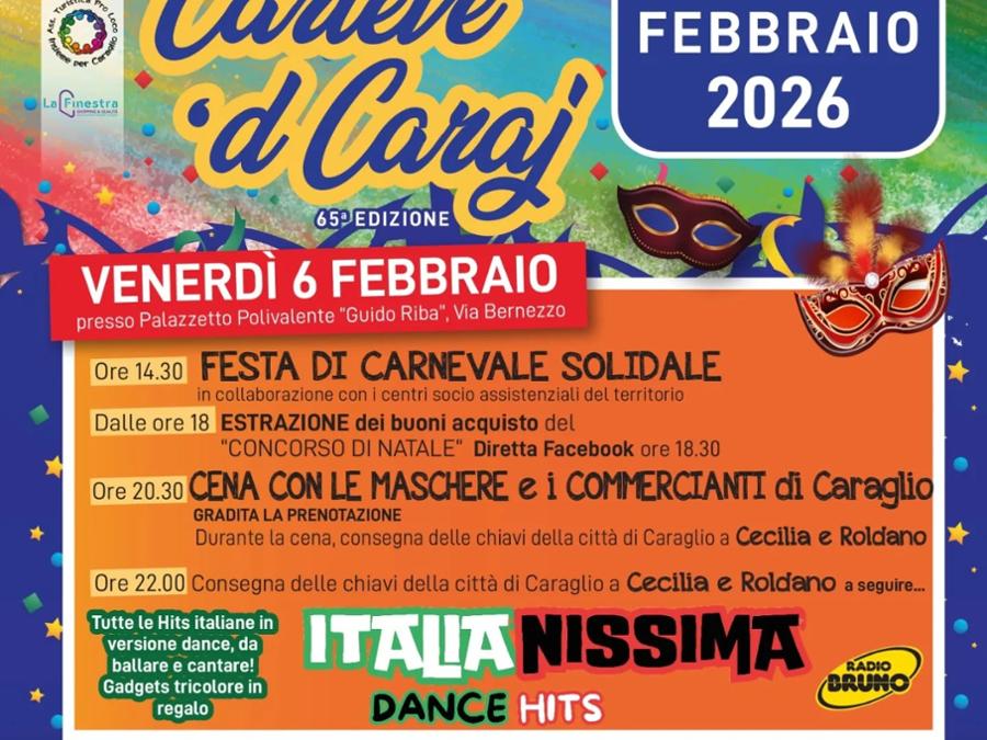 Appuntamento aperto a tutti e tutte a Caraglio, dal 6 all'8 febbraio per festeggiare il Carnevale con tutta la comunità. Tre giorni di divertimento, tra serate in musica, la sfilata dei gruppi mascherati e la tradizionale cena con la consegna delle chiavi della città a Cecilia e Roldano. Programma completo di seguito e nelle locandine allegate.
