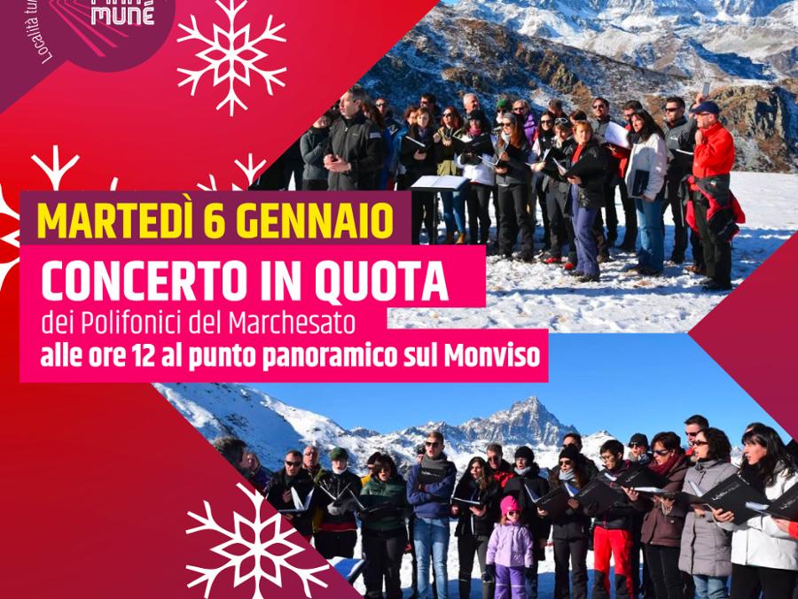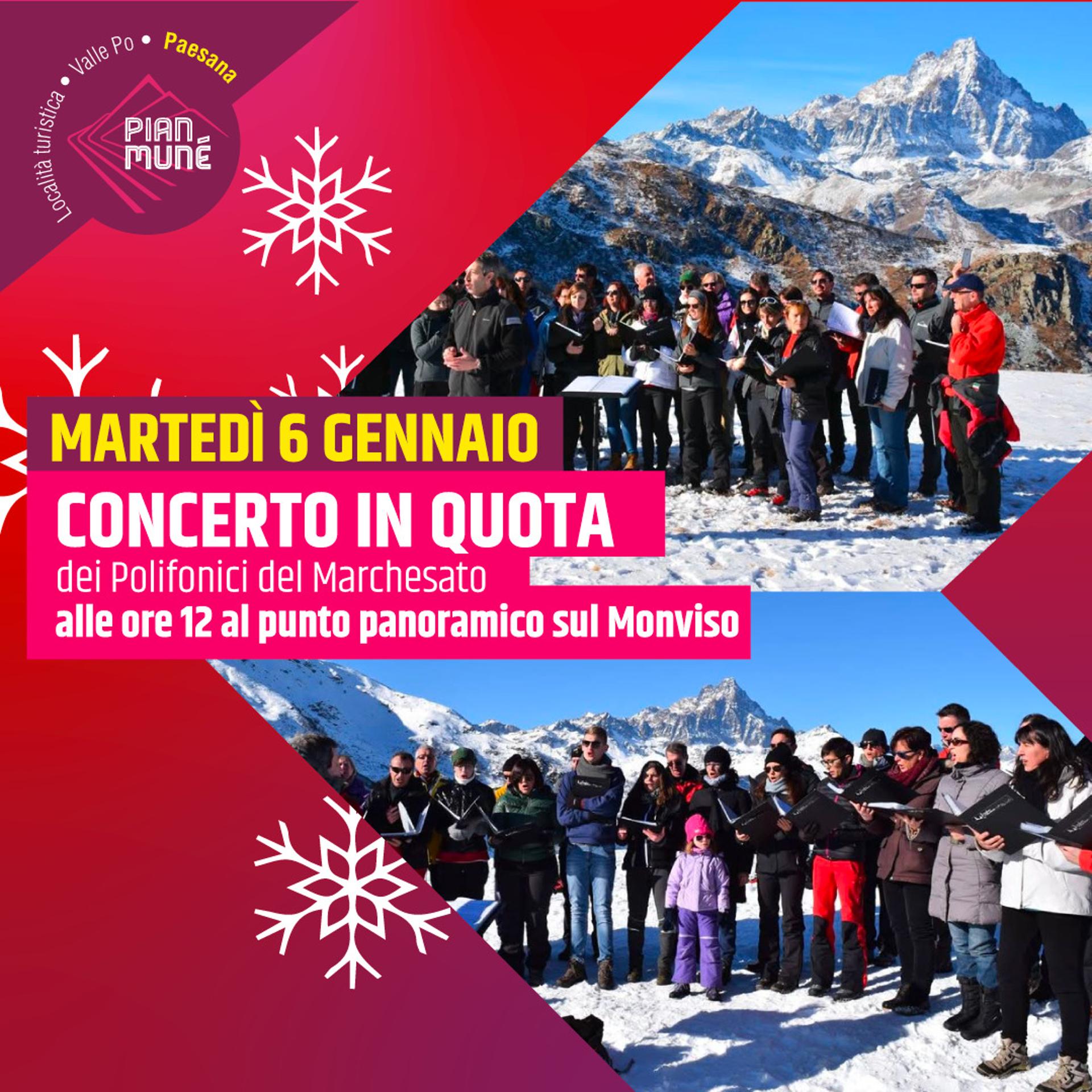 Martedì 6 gennaio, alle ore 12.00, il Rifugio Pian Munè di Paesana organizza il Concerto di Natale in quota con i Polifonici del Marchesato. Il concerto si svolgerà presso il rifugio in quota in località Fontanone, raggiungibile in circa 90 minuti a piedi e 15 minuti con la seggiovia.