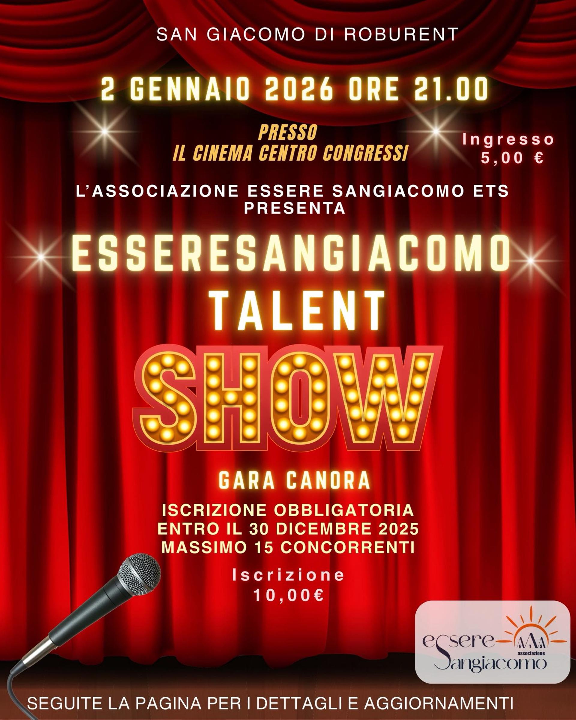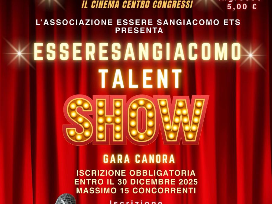 Ti piace cantare e vorresti esibirti in pubblico? Partecipa alla gara canora "Esseresangiacomo talent show" organizzata dall'associazione Essere Sangiacomo ETS il 2 gennaio alle ore 21:00 presso il Cinema centro congressi. L'iscrizione è obbligatoria entro il 30 dicembre per un massimo di 15 concorrenti. Quota di partecipazione: 10 euro per i concorrenti e 5 euro per il pubblico. Programma in aggiornamento.