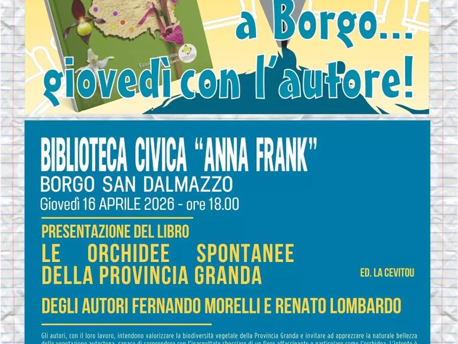Giovedì 16 aprile 2026, alle ore 18.00, la Biblioteca Civica “Anna Frank” di Borgo San Dalmazzo ospita un nuovo appuntamento della rassegna “A Borgo… giovedì con l’autore!”. Sarà presentato il volume “Le orchidee spontanee della Provincia Granda”, di Fernando Morelli e Renato Lombardo. Ingresso libero.