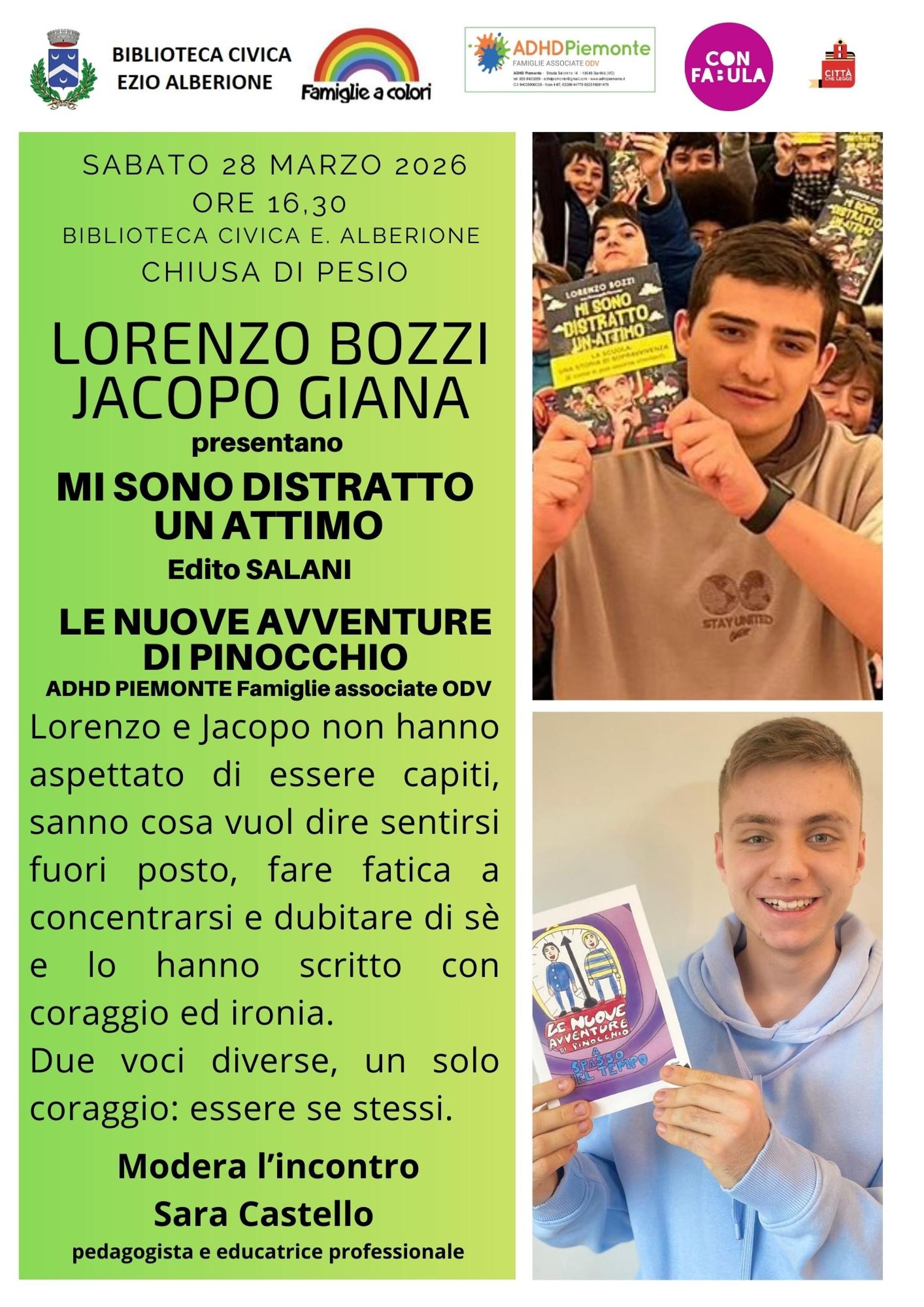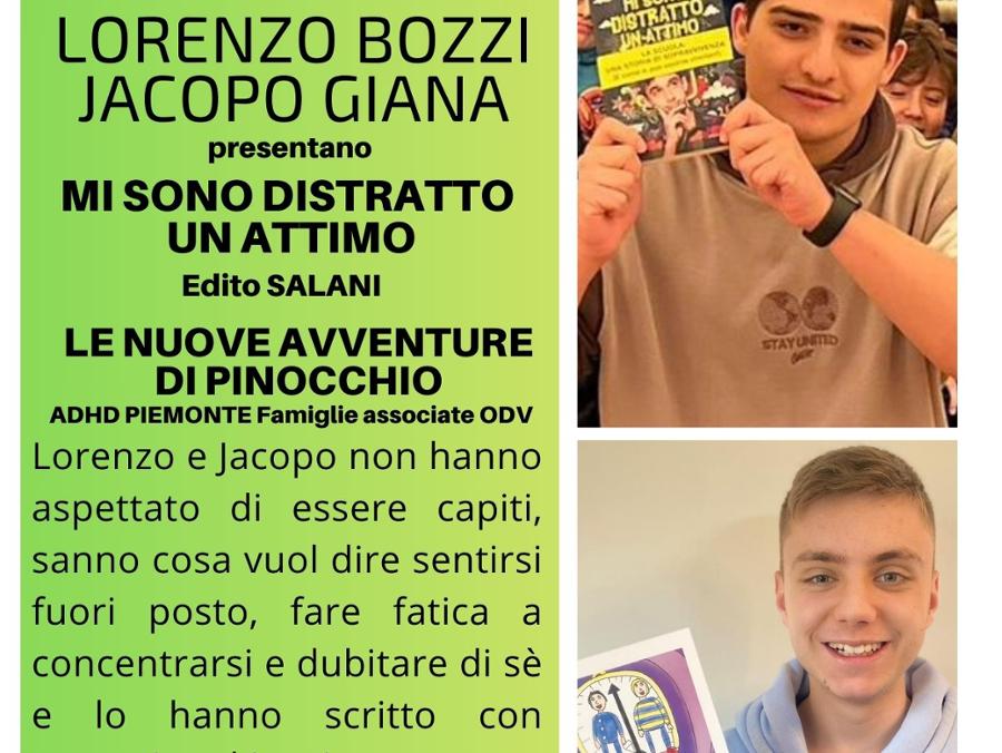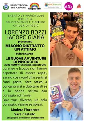 Bozzi è autore di “Mi sono distratto un attimo” edito Salani, Giana è autore di “Le nuove avventure di Pinocchio”, un progetto ADHD Piemonte – Famiglie associate ODV, dove i ragazzi raccontano la loro quotidianità con menti che corrono veloci, pensieri che si accavallano, sensazione di essere sempre fuori posto. I due ragazzi porteranno le loro storie per parlare di punti di forza e di fatiche, di scuola, di identità e del diritto di ogni ragazzo di sentirsi capito.