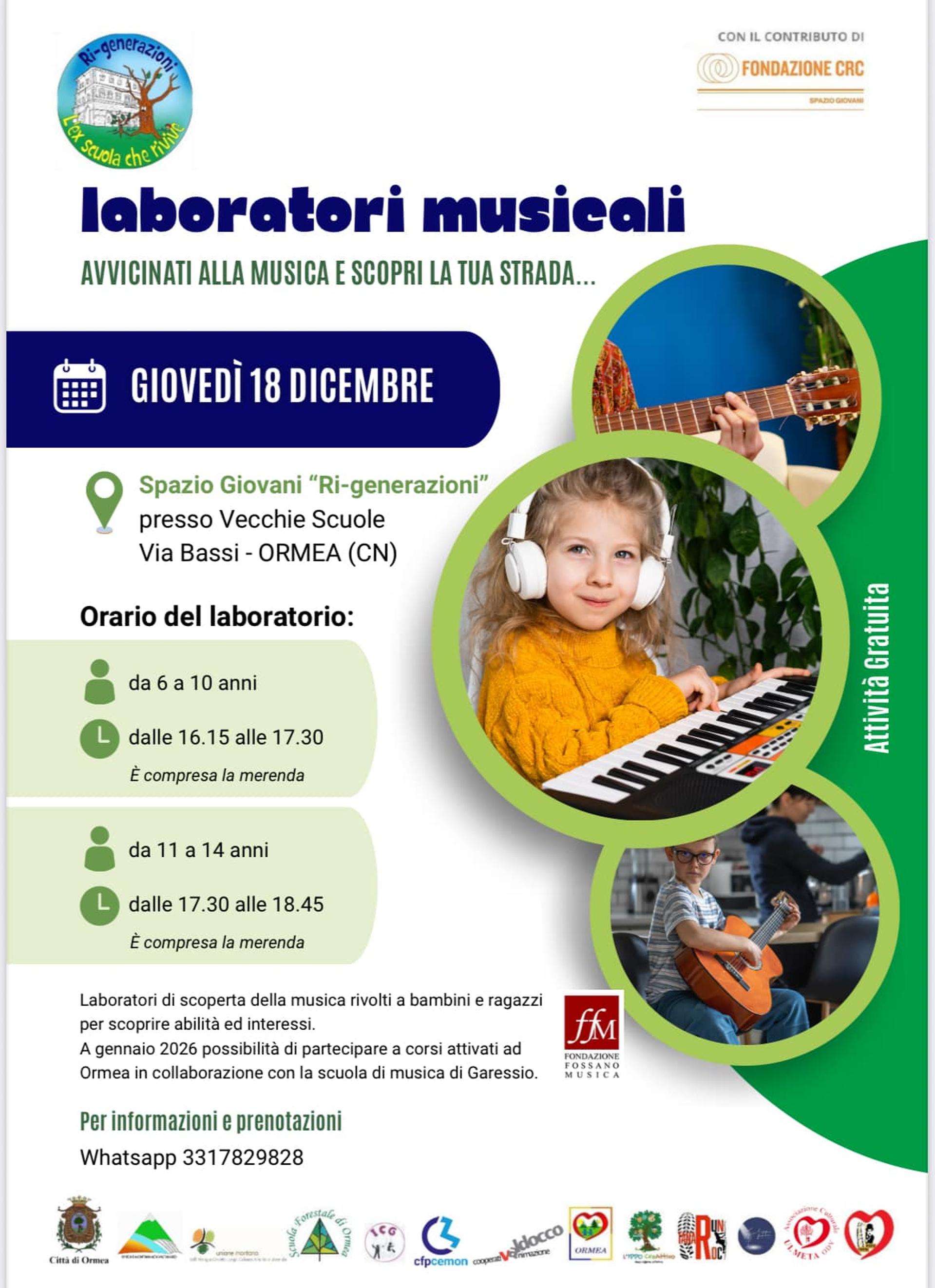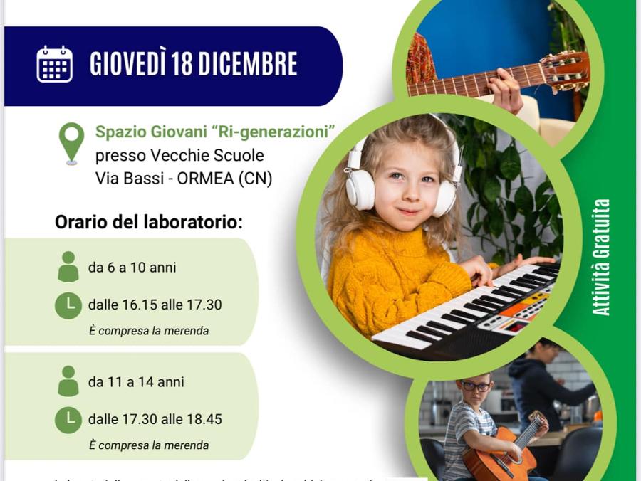 Giovedì 18 dicembre, presso le Vecchie Scuole di Via Dr.Bassi, si svolgeranno i Laboratori Musicali in collaborazione con l'Istituto Musicale di Garessio.