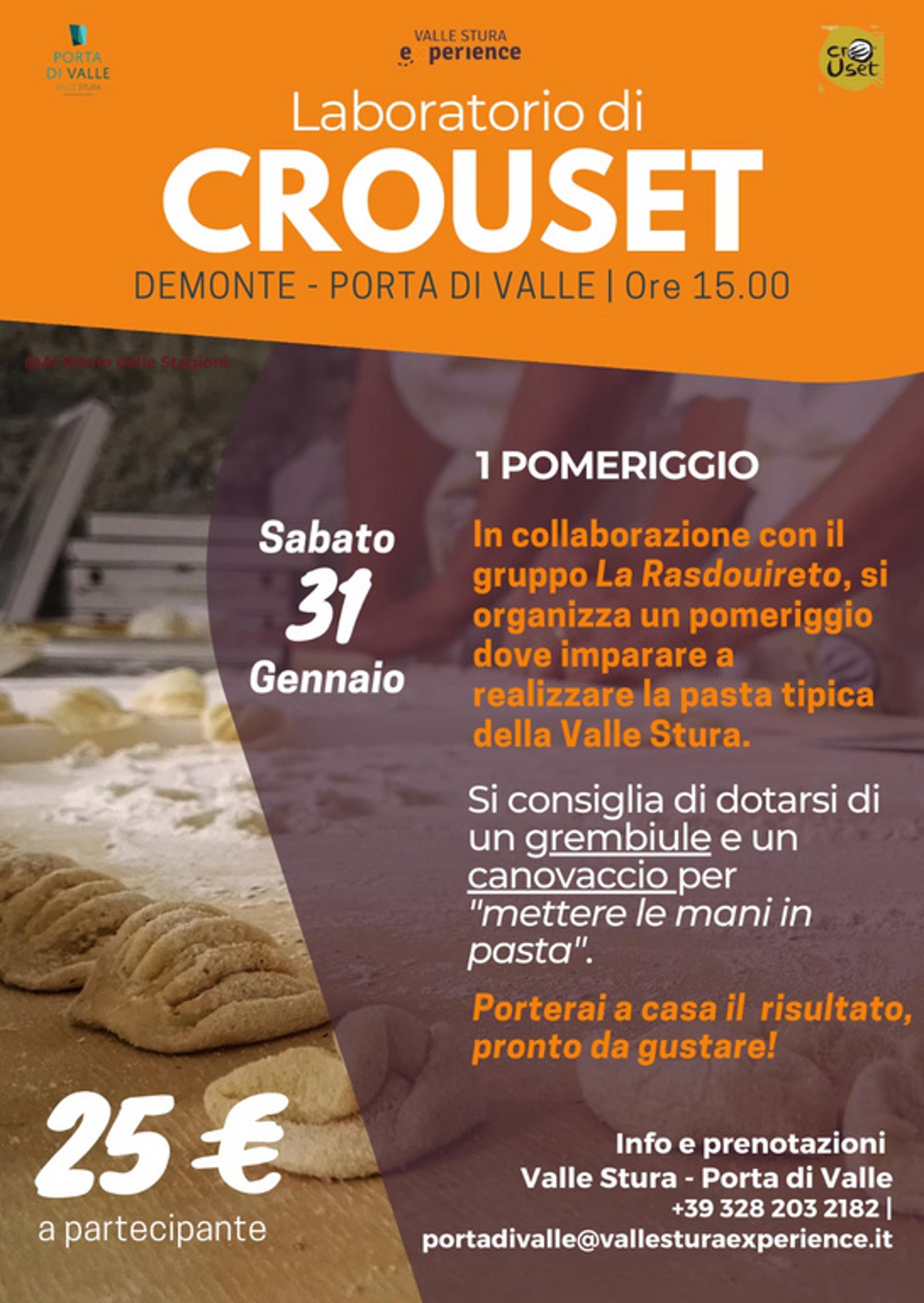 Sabato 31Maggio presso la Porta di Valle a Demonte, dalle 15 vi aspetta un pomeriggio dove imparare a realizzare la pasta tipica della Valle Stura, i crouset. Si consiglia di dotarsi di un grembiule e un canovaccio per mettere le mani in pasta. Si porterà a casa il risultato, pronto da gustare! Prenotazione obbligatoria.