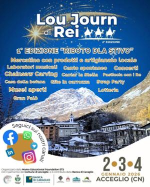 Ad Acceglio dal 2 al 4 gennaio "Le Journ di Rei", tantissimi eventi per festeggiare la Befana e l'arrivo dei Re Magi: mostra mercato dell'Epifania negli spazi riscaldati del Comune con tantissime bancarelle di oggettistica e artigianato, visite guidate al Museo di Arte Sacra e al Museo dell'Orologio, laboratori per bambini, appuntamenti enogastronomici, musicali e grande falò finale.