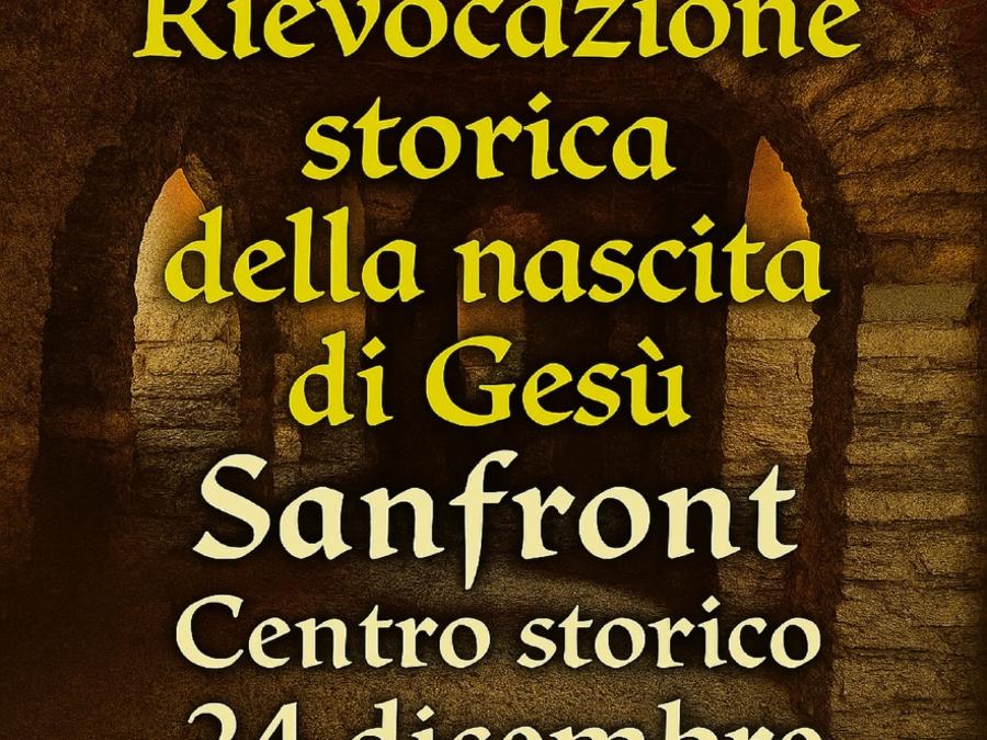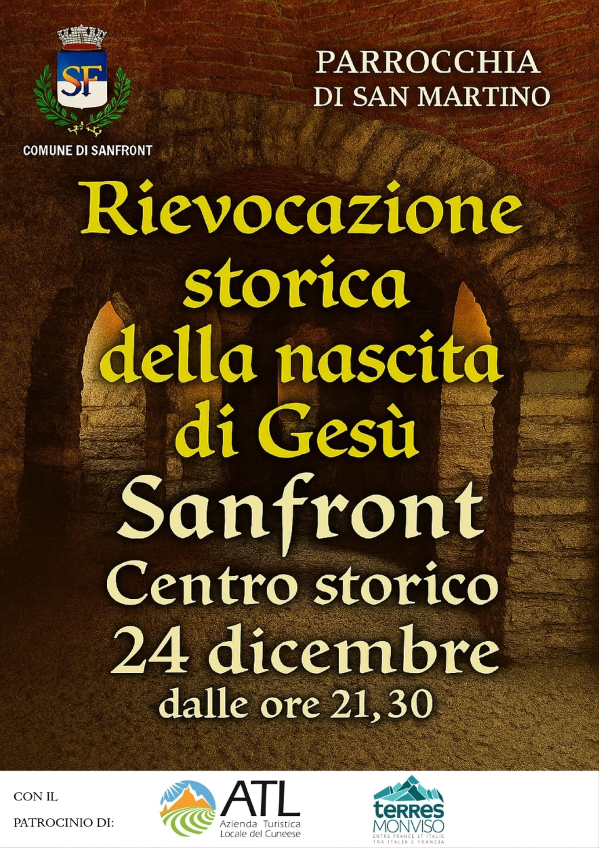 Mercoledì 24 dicembre dalle 21.30 a Sanfront viene riproposta la tradizionale rievocazione storica della natività di Gesù, tra le vie del centro storico: da via Mazzini (parallela alla centrale piazza Statuto) fino a piazza XXIV Maggio e piazza Ferrero. Le comparse e i personaggi degli antichi mestieri prepareranno frittelle, vin brulé, castagne e dolci tipici locali, da distribuire ai visitatori durante l'evento. Ad allietare la serata ci saranno i canti dei gruppi itineranti "J amis del Cher” e “Il piccolo cantiere”, e i balli occitani animati da "Balerin del bal Vej".