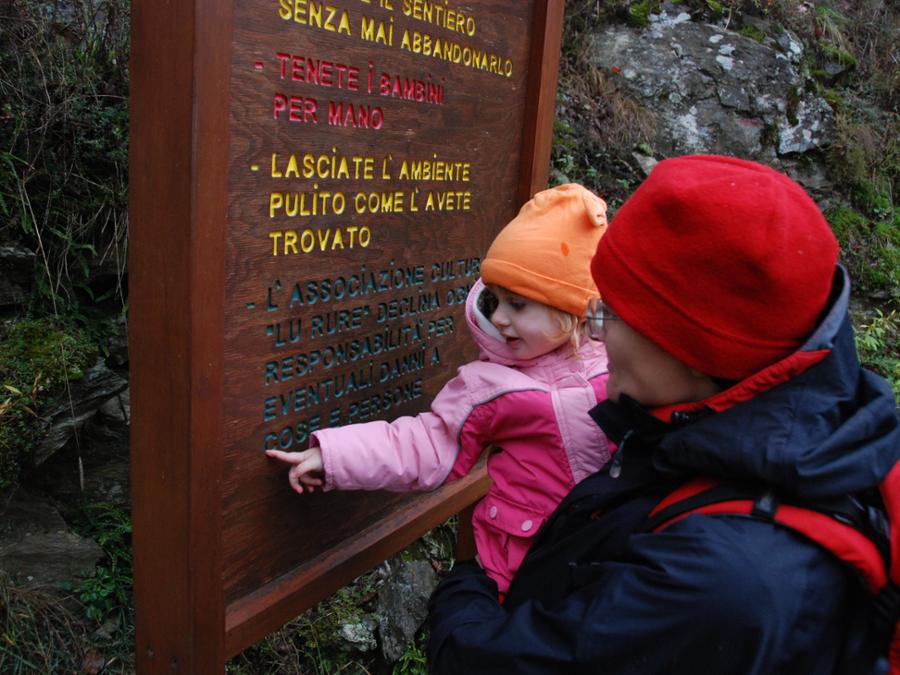From the information board, continue along the grassy track to the input system of the Sampeyre - Brossasco canal. Cross the Ciantorane river twice across stone and cement bridges. A bit further on, another panel describes the local flora and the cart track becomes a trail and starts to climb fairly steeply. At each fork in the trail, keep to the left to say along the river. When the trail flattens out, look out for the Sarvanots! They like to hide in the foliage, so you’ll need to look carefully if you want to catch them off guard.