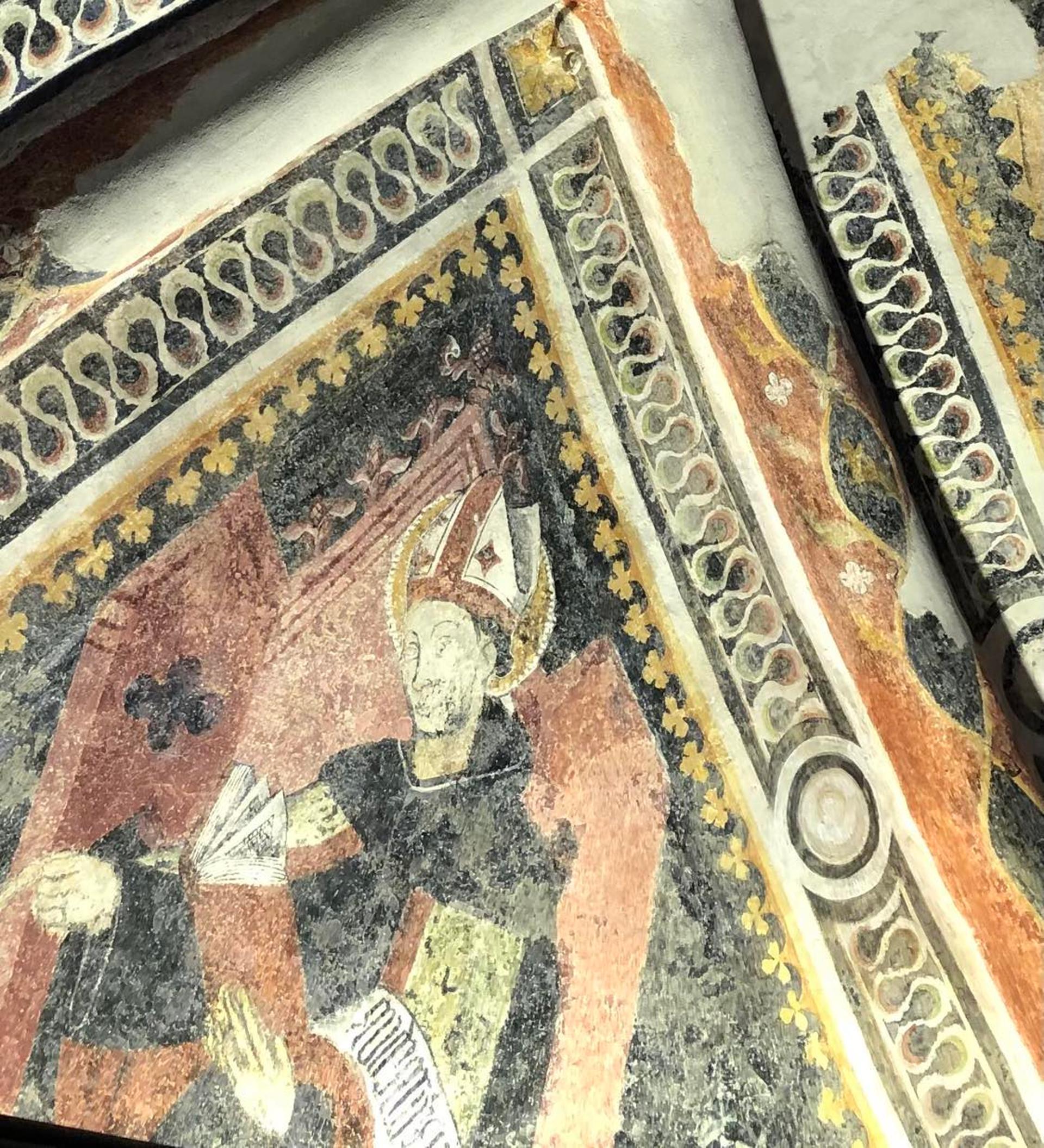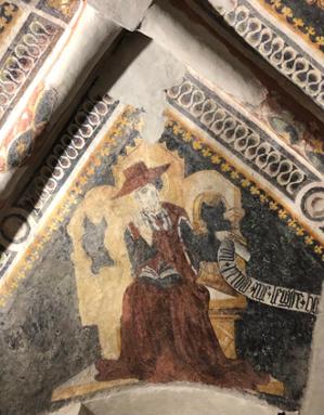 Il momento più bello della cappella è la volta a crociera con le figure bellissime dei Padri della Chiesa: San Girolamo con il cappello da cardinale ed in mano un cartiglio ancora da decifrare, Sant’Ambrogio affrescato con in mano il frustino, San Agostino dipinto con in mano il libro pronto ad insegnare, San Gregorio Magno dipinto con le vesti di Papa. Nella volta si osservano inoltre molti affreschi di cartigli scritti in epoca quattrocentesca la cui traduzione è attualmente in fase di studio.