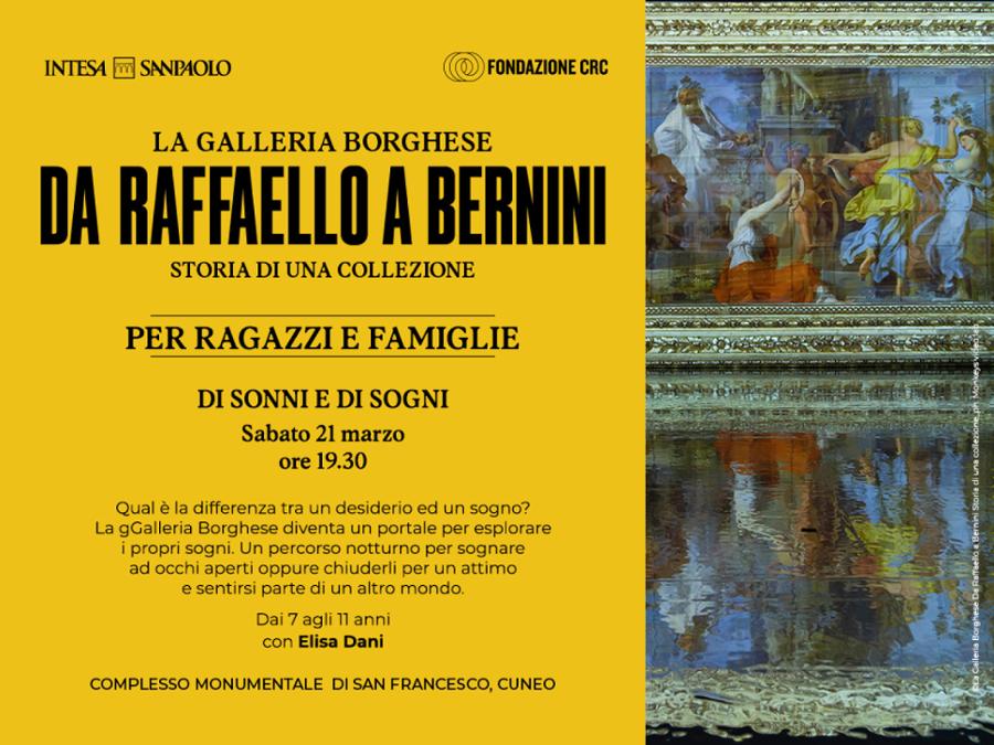 Sabato 21 marzo, alle 19.30 a Cuneo presso il Complesso Monumentale di San Francesco, visita spettacolo notturna in mostra per bambini dai 7 agli 11 anni con Elisa Dani. La Galleria Borghese diventa un portale per esplorare i propri sogni. Evento gratuito a prenotazione obbligatoria.