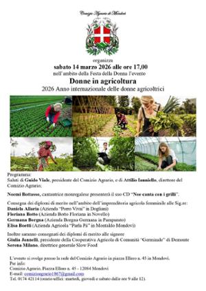 Il Comizio Agrario di Mondovì organizza Sabato 14 marzo 2026 alle ore 17 presso la sede di Mondovì "Donne in agricoltura, 2026 anno delle Donne Agricoltrici"