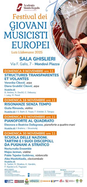 Per quattro domeniche consecutive (9-16-23 e 30 novembre, ore 11.00), Sala Ghislieri, a Mondovì presso Via Francesco Gallo 7, torna a essere palcoscenico del talento musicale internazionale con la nuova edizione del Festival GME – Giovani Musicisti Europei, organizzato dall’Academia Montis Regalis. Un festival che nasce per volontà di Lutz Ludemann, figura di riferimento nella vita musicale monregalese per privilegiare i giovani talenti emergenti.