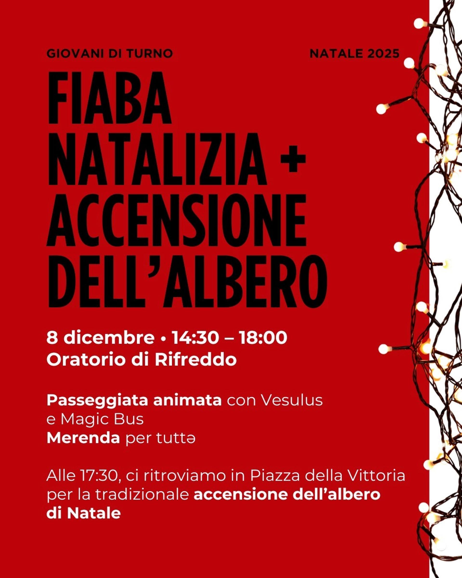 Lunedì 8 dicembre dalle 14.30 alle 18.00, l'associazione Giovani di Turno ETS di Rifreddo invita tutti e tutte ad una passeggiata animata guidata dai professionisti di Vesulus e di Magic Bus. Partenza del percorso dall’oratorio (via Braide, 2), con tappe al Monastero e ritorno al Rifreddo Landscape Lab, per una merenda offerta dalla Protezione Civile ANA. Babbo Natale farà una visita speciale! Alle 17.30 da non perdere l'accensione dell’albero di Natale in piazza della Vittoria. Iscrizioni cliccando qui.