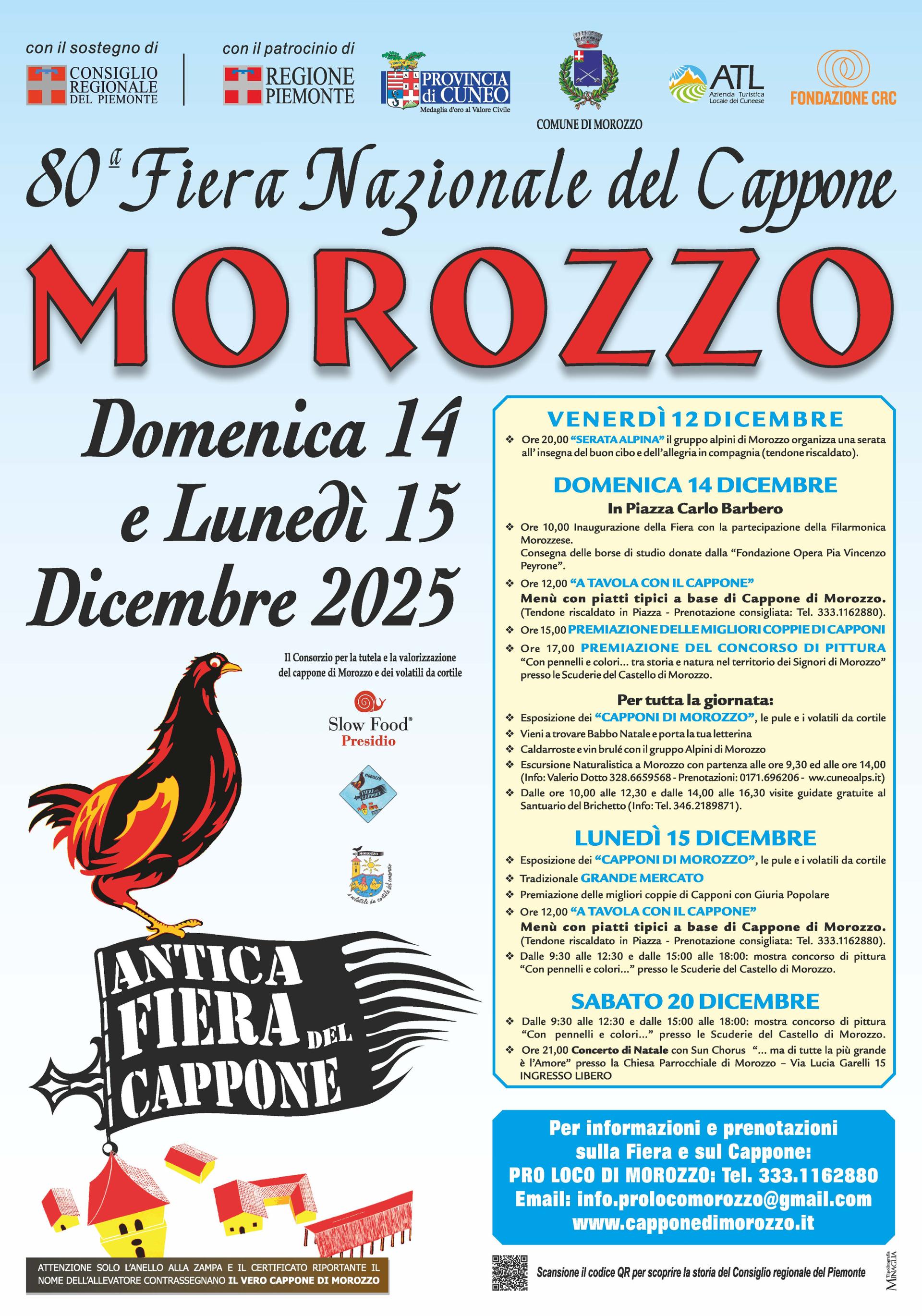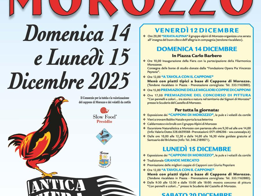 In occasione delle festività natalizie la tradizione cuneese vuole che venga cucinato il cappone, che proprio a Morozzo viene celebrato con l’omonima Fiera. Per cui, appuntamento aperto a tutti, domenica 14 e lunedì 15 dicembre con la Fiera del Cappone 2025. I capponi di Morozzo sono oggi considerati tra i migliori al mondo per la tenerezza ed il gusto della loro carne. Il programma è disponibile di seguito e sul sito del Comune di Morozzo.