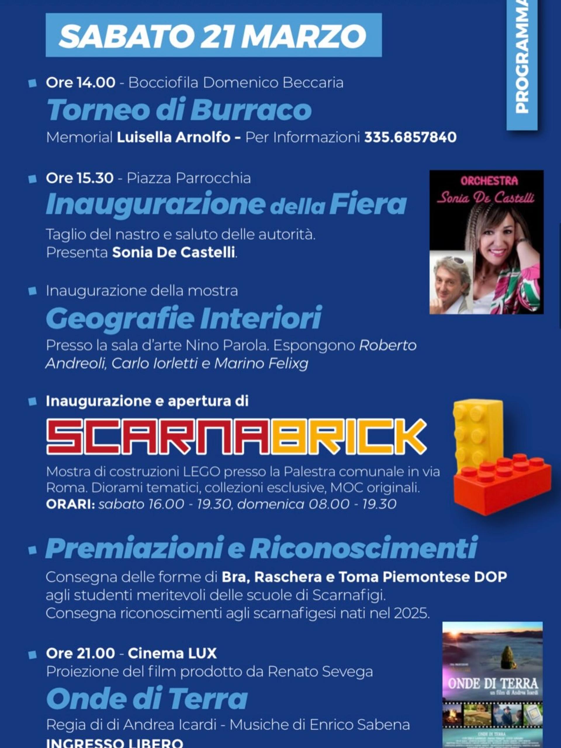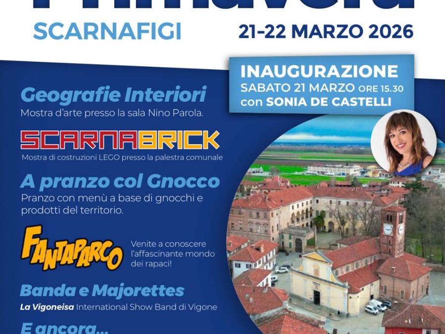 Sabato 21 e domenica 22 marzo 2026 si terrà a Scarnafigi la Fiera di Primavera. Per le vie del paese ci saranno il mercatino dell’antiquariato, bancarelle di artigiani e hobbisti, musica dal vivo ed esibizioni di danza. È previsto anche un raduno di auto d’epoca e tante altre iniziative per tutti. Inaugurazione sabato alle ore 15.30.