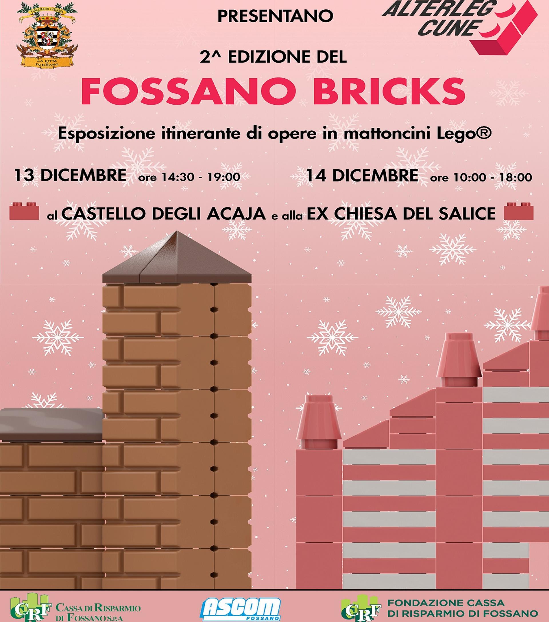 Sabato 13 e domenica 14 dicembre a Fossano il Castello dei Principi d'Acaia e l'ex chiesa del Salice Vecchio ospitano la seconda edizione di Fossano Briks: esposizione itinerante di opere create con i più celebri mattoncini da costruzione. Orari: sabato dalle 14.30 alle 19.00; domenica dalle 10.00 alle 18.00. Ingresso libero.