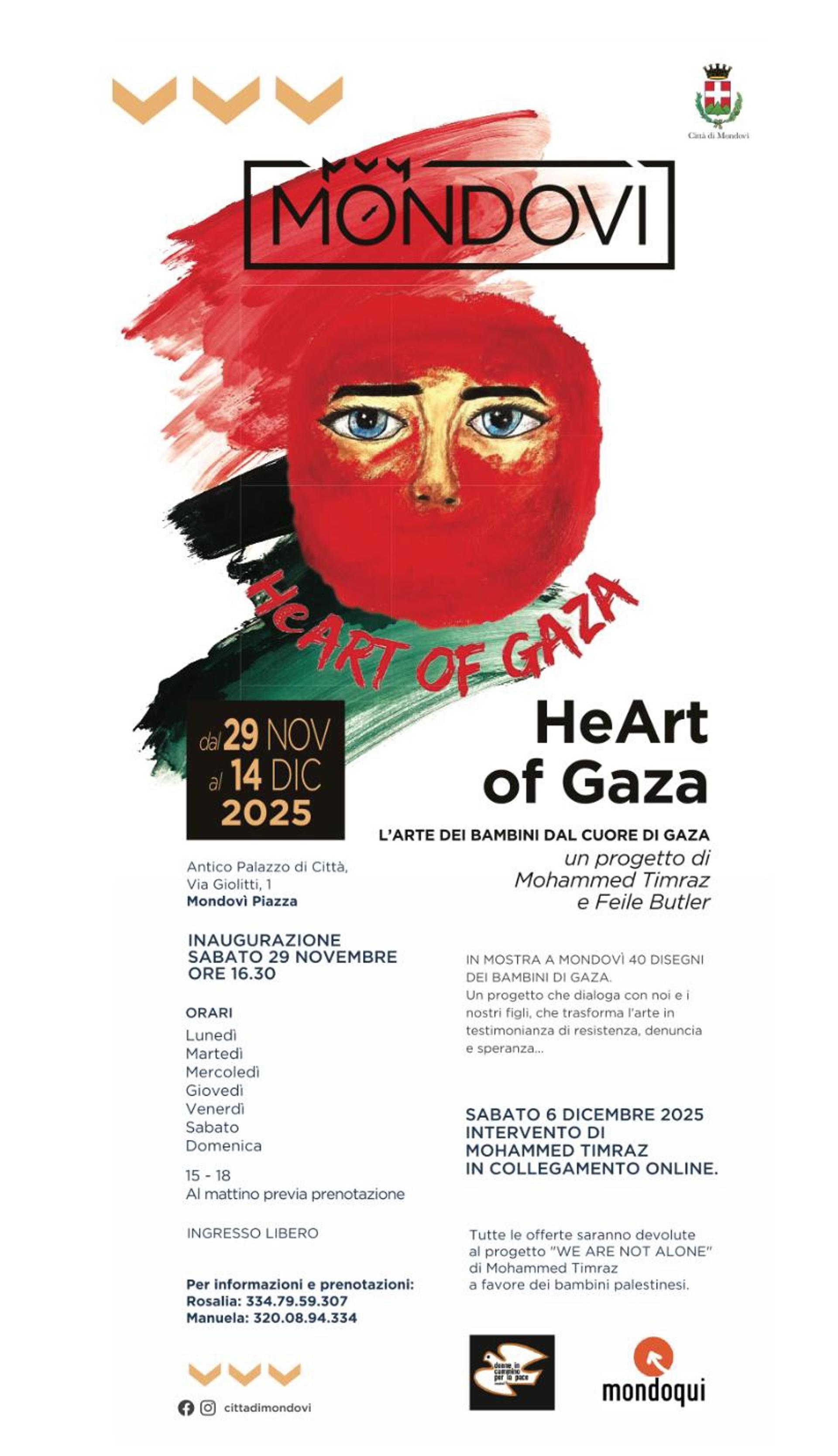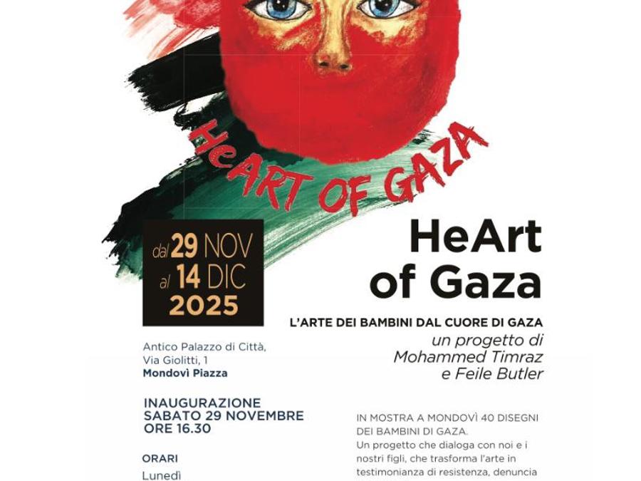 HeART of Gaza è una mostra itinerante di opere d’arte create da bambini dai 3 ai 17 anni che vivono o vivevano a Gaza. È organizzata a Mondovì dalle Donne in cammino per la pace Mondovì e dal Tavolo di coordinamento comunale per la pace e l’educazione ad una cittadinanza attiva, è visitabile dal 29 novembre al 14 dicembre presso il Palazzo di Città, tutti i giorni compresi i festivi, dalle 15 alle 18, e al mattino su prenotazione telefonica. Inaugurazione sabato 29 novembre alle 16.30. Ingresso libero.
