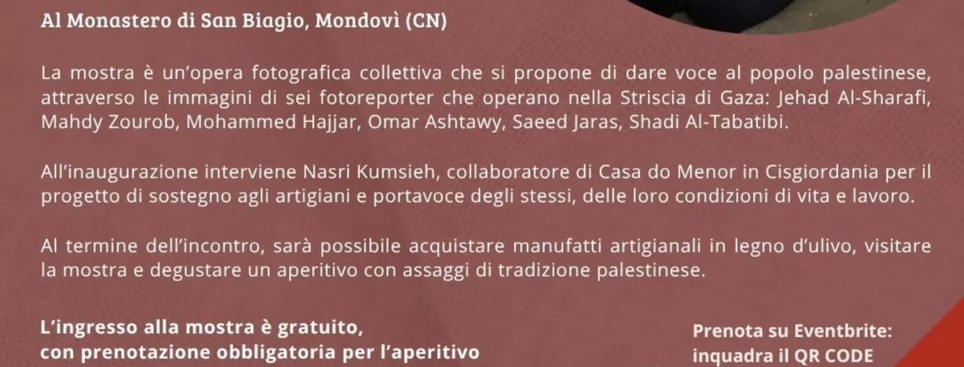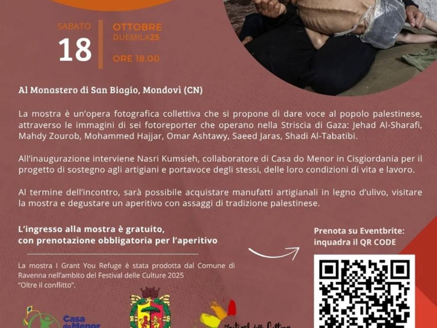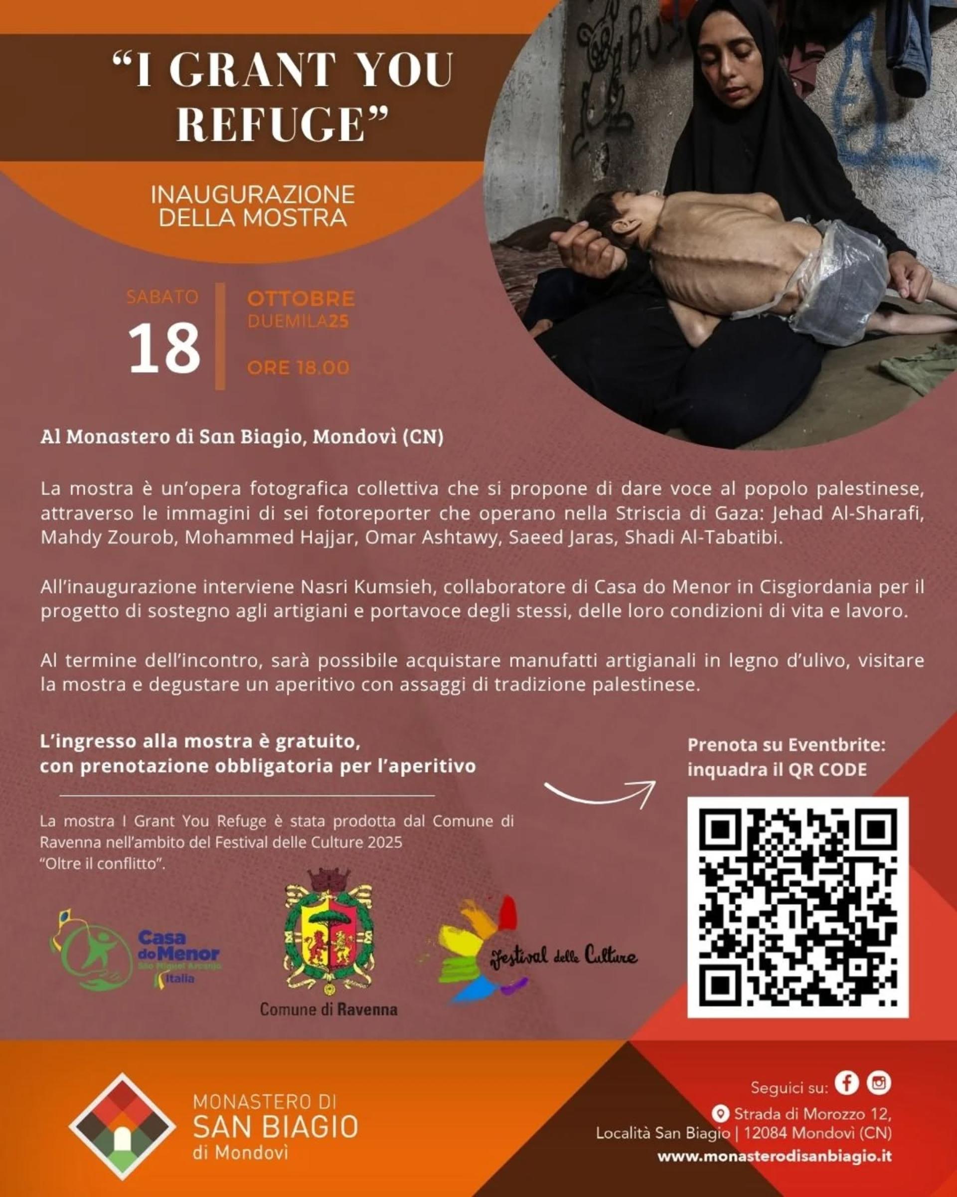 Sabato 18 ottobre, alle ore 18.00 al Monastero di San Biagio di Mondovì, verrà inaugurata la mostra "I grant You Refuge", opera di sei fotoreporter palestinesi. La mostra, prodotta dal Comune di Ravenna nell'ambito del Festival delle Culture 2025 e curata dal documentarista Paolo Patruno, sarà visitabile fino al 15 dicembre. Ingresso libero.