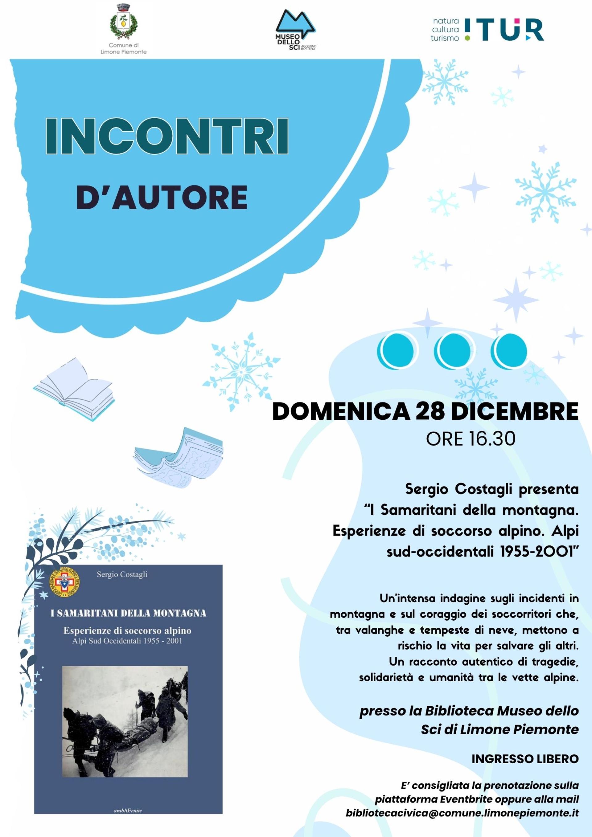 Domenica 28 dicembre alle ore 16:30 presso la Biblioteca Museo dello sci di Limone Piemonte Sergio Costagli presenta ”I Samaritani della montagna. Esperienze di soccorso alpino”. Ingresso libero.