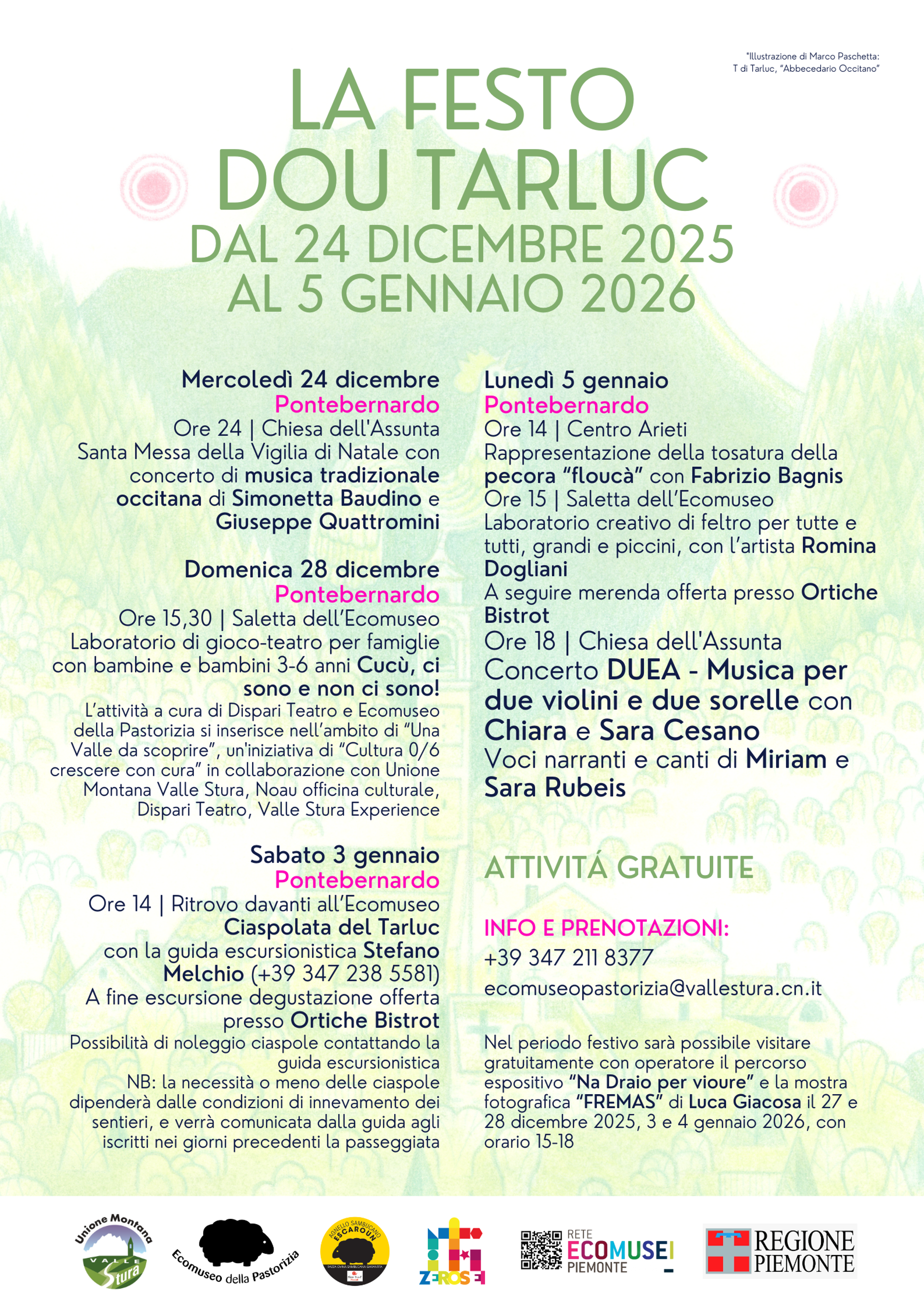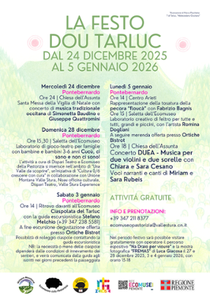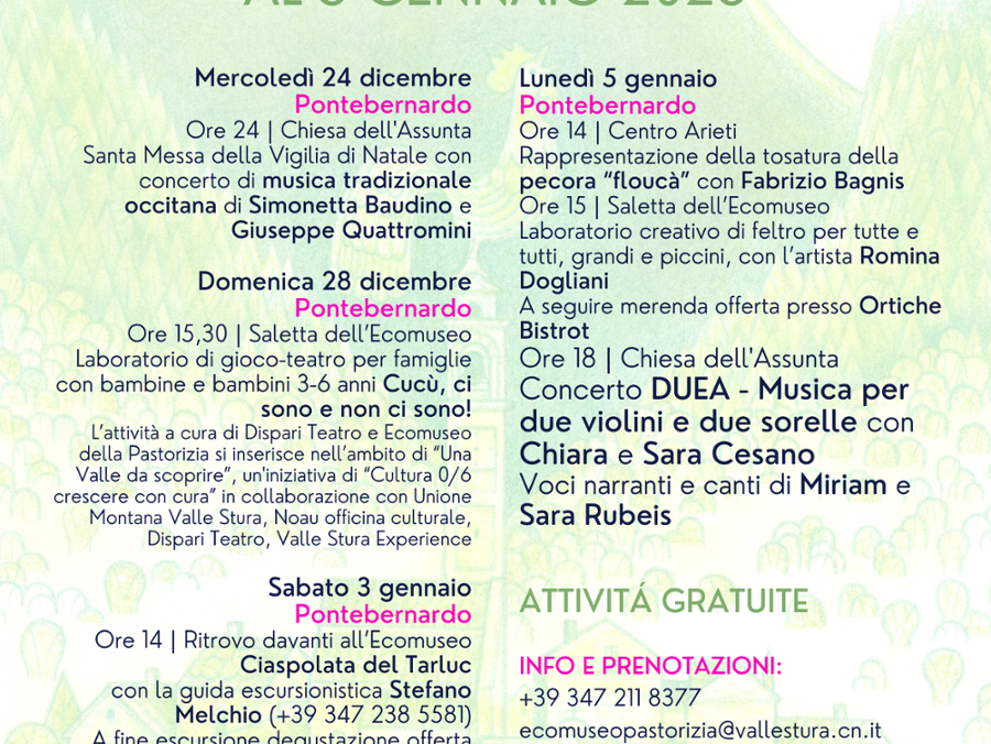 Lunedì 5 gennaio 2026, ore 14 Centro arieti, Pontebernardo dimostrazione di tosatura della pecora “floucà” con Fabrizio Bagnis; alle ore 15 presso la Saletta dell'Ecomuseo a Pontebernardo laboratorio di feltro per tutte e tutti, grandi e piccini con l’artista Romina Dogliani. A seguire merenda presso Ortiche Bistrot. Alle ore 18 presso la Chiesa dell’Assunta, Pontebernardo Concerto “DUEA - Musica per due violini e due sorelle” di Sara e Chiara Cesano. Voci narranti e canti di Miriam e Sara Rubeis.