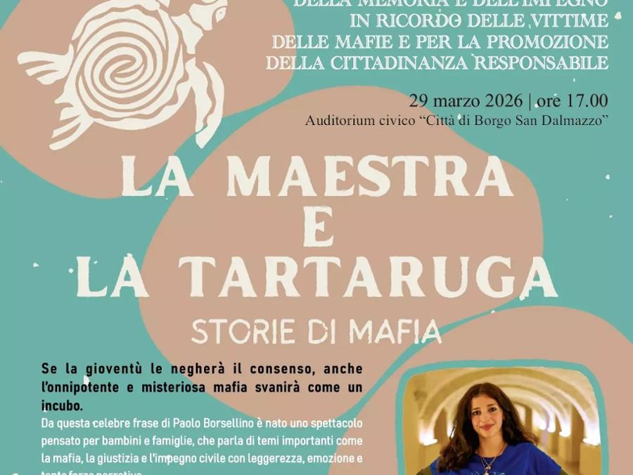 ll 29 marzo alle ore 17, l’Auditorium Civico ospiterà lo spettacolo teatrale La Maestra e la Tartaruga, messo in scena dalla Nuova Compagnia Teatrale APS di Verona, per la Giornata della memoria e dell’impegno in ricordo delle vittime innocenti delle mafie.