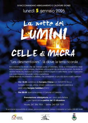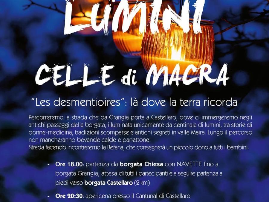 Lunedì 5 gennaio, a partire dalle ore 18,00 a Celle di Macra, il suggestivo borgo della Valle Maira vivrà una delle sue serate più magiche: "La Notte dei Lumini". La manifestazione prende vita lungo il percorso che collega la borgata "Grangia" alla borgata "Castellaro", quest’ ultima illuminata esclusivamente da centinaia di lumini. Giunti nel cuore della borgata, la festa proseguirà alle 20:30 con un’apericena presso il castello di Castellaro ‘il Cantounal’. Evento gratuito, prenotazione obbligatoria per l'apericena.