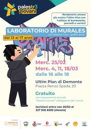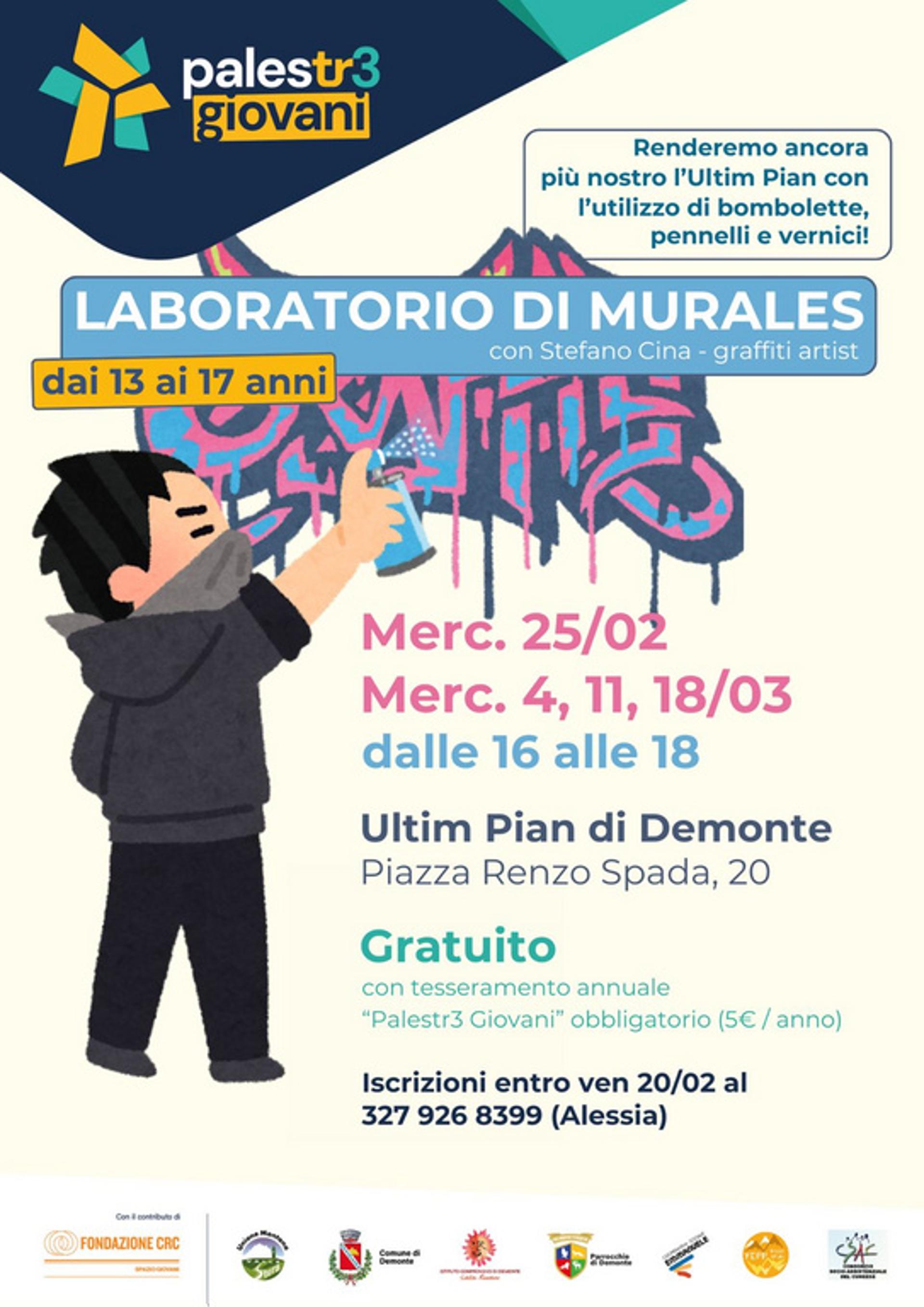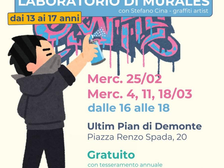 In partenza con il progetto Palestr3 giovani un laboratorio di Murales con Stefano Cina, graffiti artist presso l'Ultim Pian di Demonte nei giorni mercoledì 25 febbraio, e 4, 11 e 18 marzo. Dai 13 ai 17 anni.