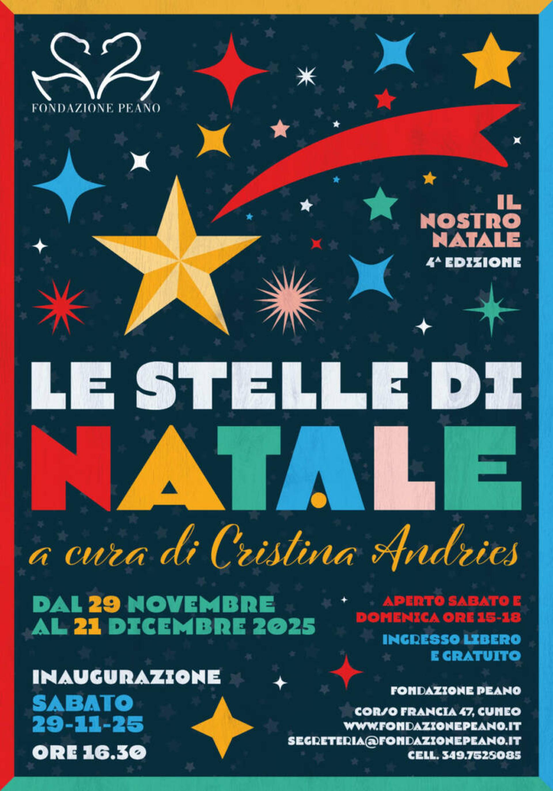 La quarta edizione della rassegna “Il nostro Natale”, curata da Cristina Andries, ruota attorno al tema “Le stelle di Natale” e propone un’esposizione collettiva presso la Fondazione Peano a Cuneo che mette assieme lavori artistici realizzati nel corso degli ultimi mesi attraverso laboratori artistici di diversa natura. La mostra sarà visitabile i sabati e le domeniche, dalle ore 15 alle 18, con ingresso gratuito fino al 21 dicembre.
