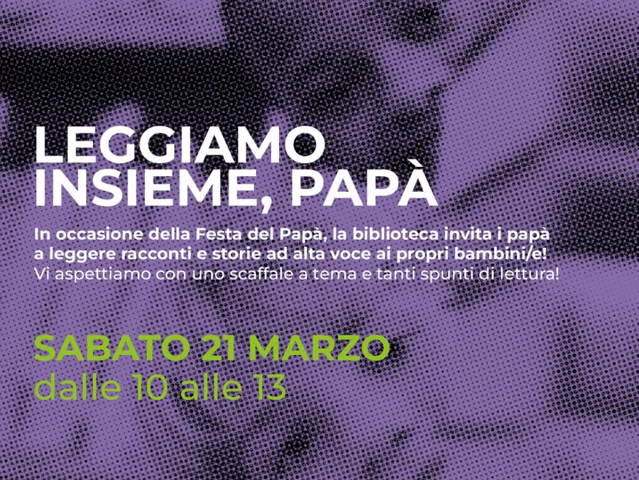 Sabato 21 marzo, alle ore 10.00, presso la Biblioteca Civica di Saluzzo, in occasione della Festa del Papà si terrà "Leggiamo insieme, papà", una mattinata in cui i papà saranno invitati a leggere racconti e storie ad alta voce ai propri bambini. Ingresso gratuito.
