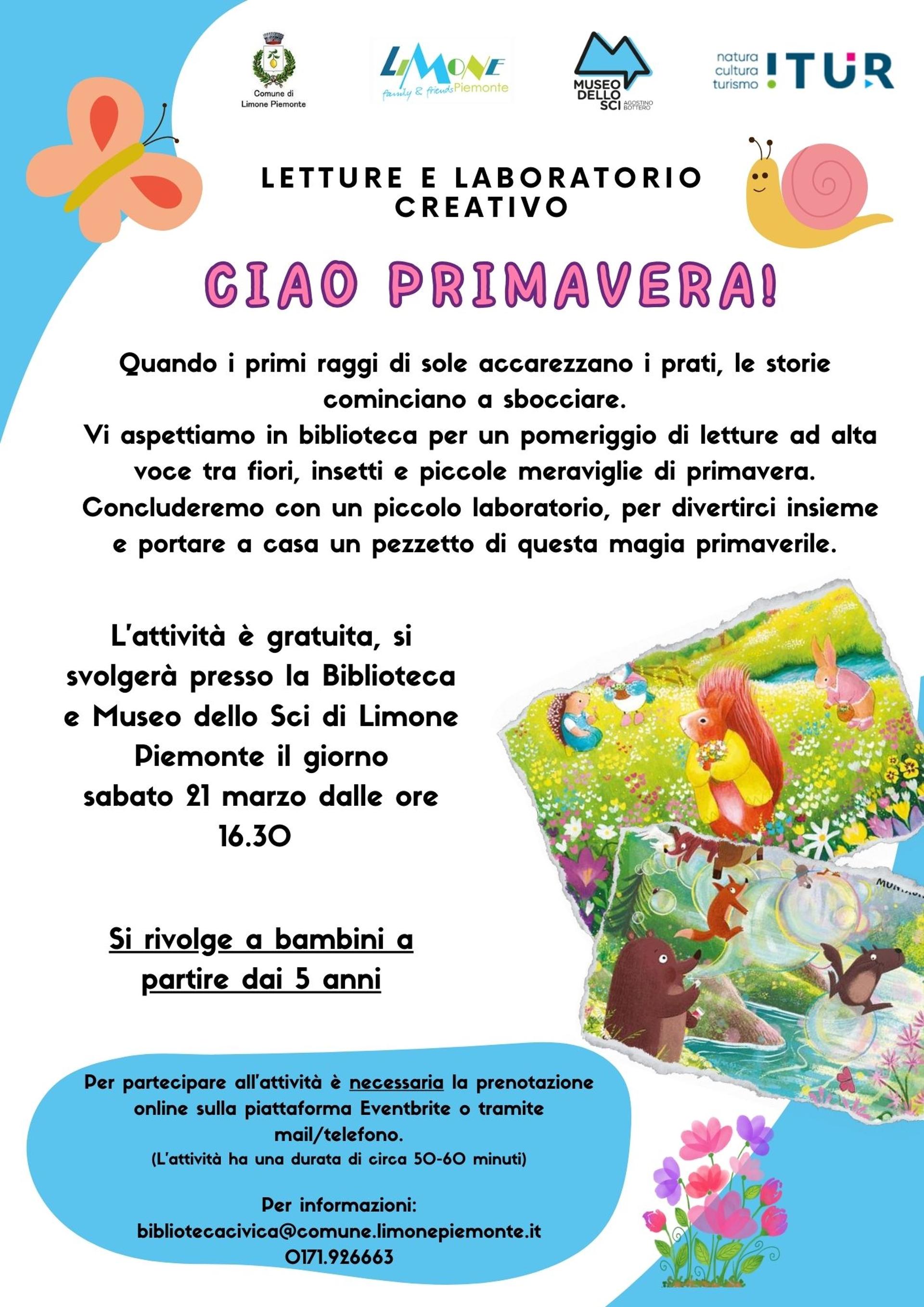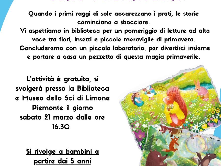 Sabato 21 marzo, alle 16.30 presso la biblioteca civica di Limone Piemonte, letture e laboratorio creativo a tema primaverile. L'attività si rivolge ai bambini a partire dai 5 anni, per partecipare è necessaria la prenotazione, gratuita, sulla piattaforma Eventbrite.