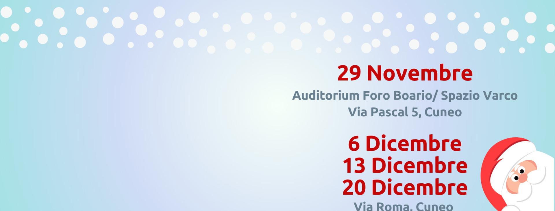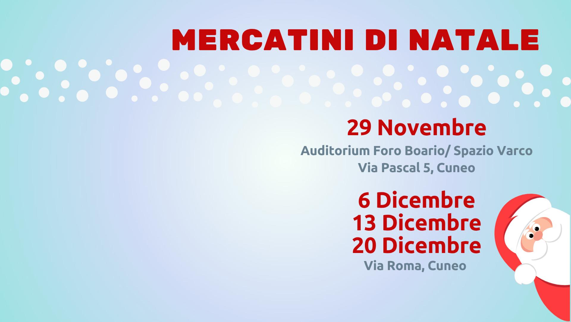 Sabato 6, 13 e 20 dicembre in via Roma a Cuneo, dalle 10.30 alle 19.30, mercatini di Natale organizzati da Made in Cuneo. Un'esposizione di idee, progetti e creazioni di artisti a km zero per le festività natalizie.