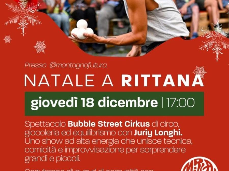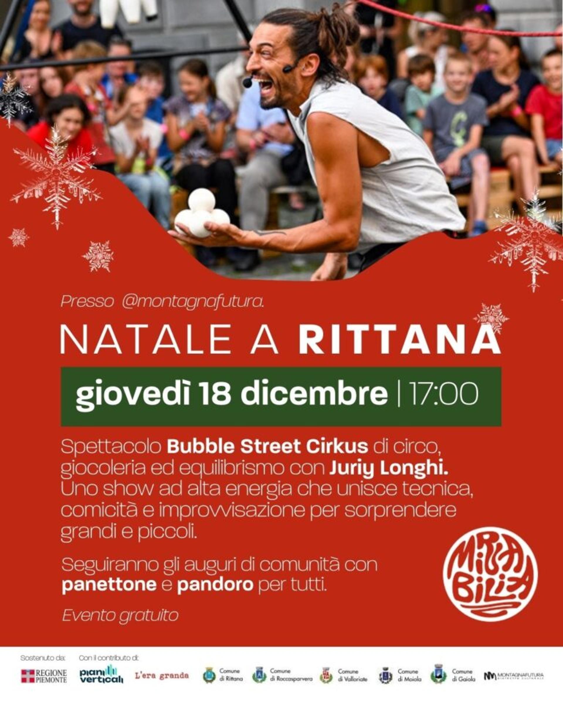 Il Natale a Rittana si accende di energia, allegria e stupore giovedì 18 dicembre alle ore 17, presso la bocciofila di Rittana, andrà in scena lo spettacolo Bubble Street Cirkus con Jurij Longhi, artista che unisce giocoleria, equilibrismo e comicità in un’esibizione capace di coinvolgere grandi e piccoli. Evento gratuito.