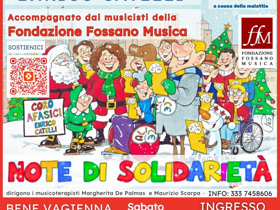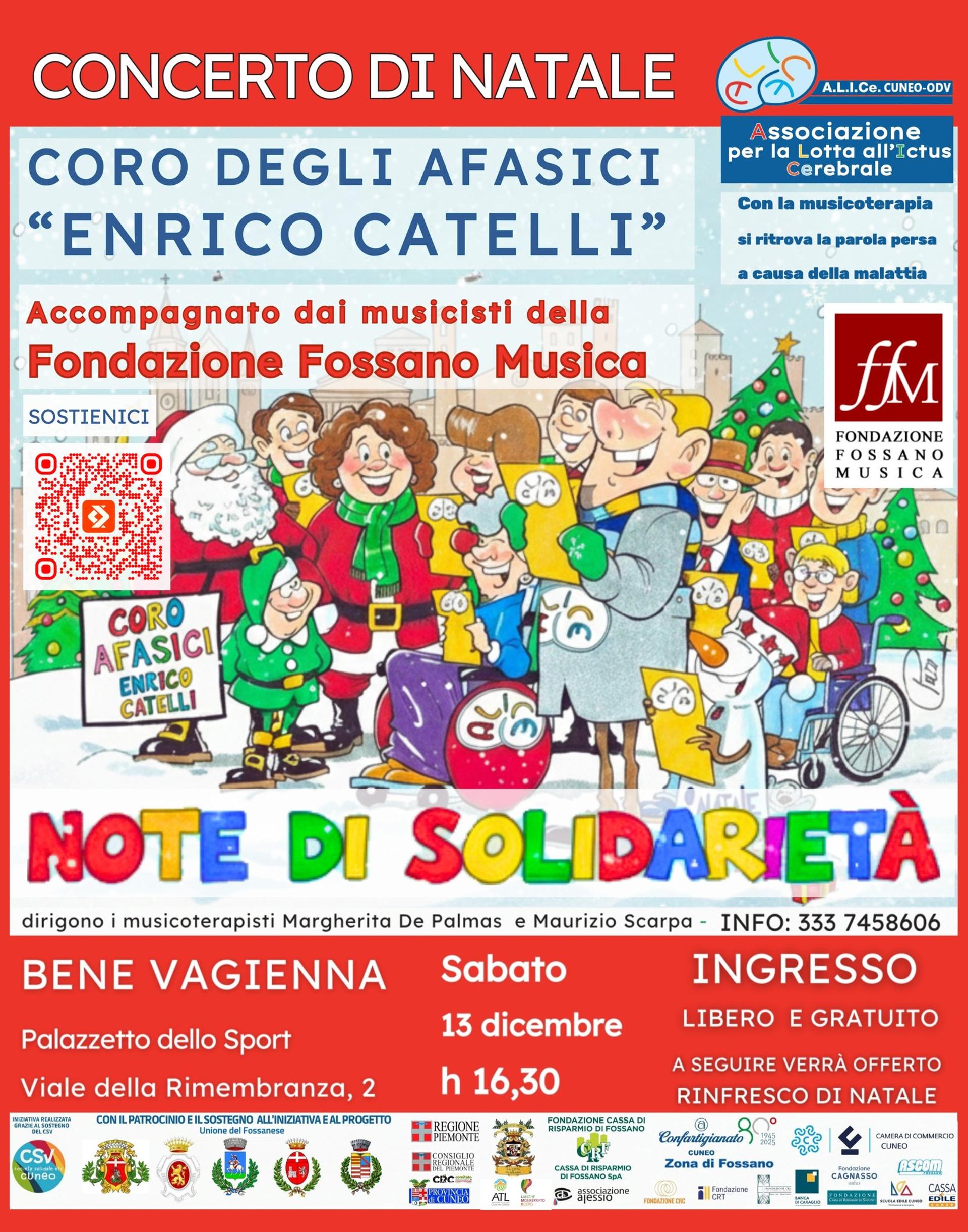 Sabato 13 dicembre alle ore 16.30 presso il Palazzetto dello Sport di Bene Vagienna "Note di Solidarietà": concerto di Natale del Coro degli Afasici "Enrico Castelli" - Alice Cuneo ODV, accompagnati dai musicisti della Fondazione Fossano Musica. Ingresso libero.