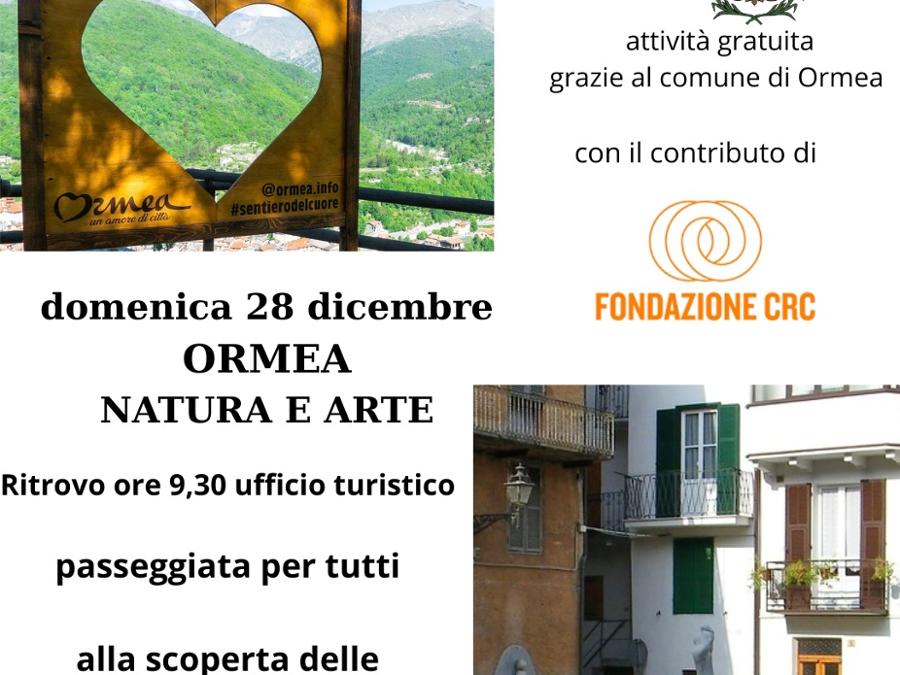 Domenica 28 dicembre "Ormea Natura e Arte", grazie al sostegno del Comune di Ormea e al contributo della Fondazione CRC, siamo lieti di offrire una passeggiata gratuita, alla scoperta dei tesori nascosti del borgo e del suo entroterra, guidata da Marina Caramellino.