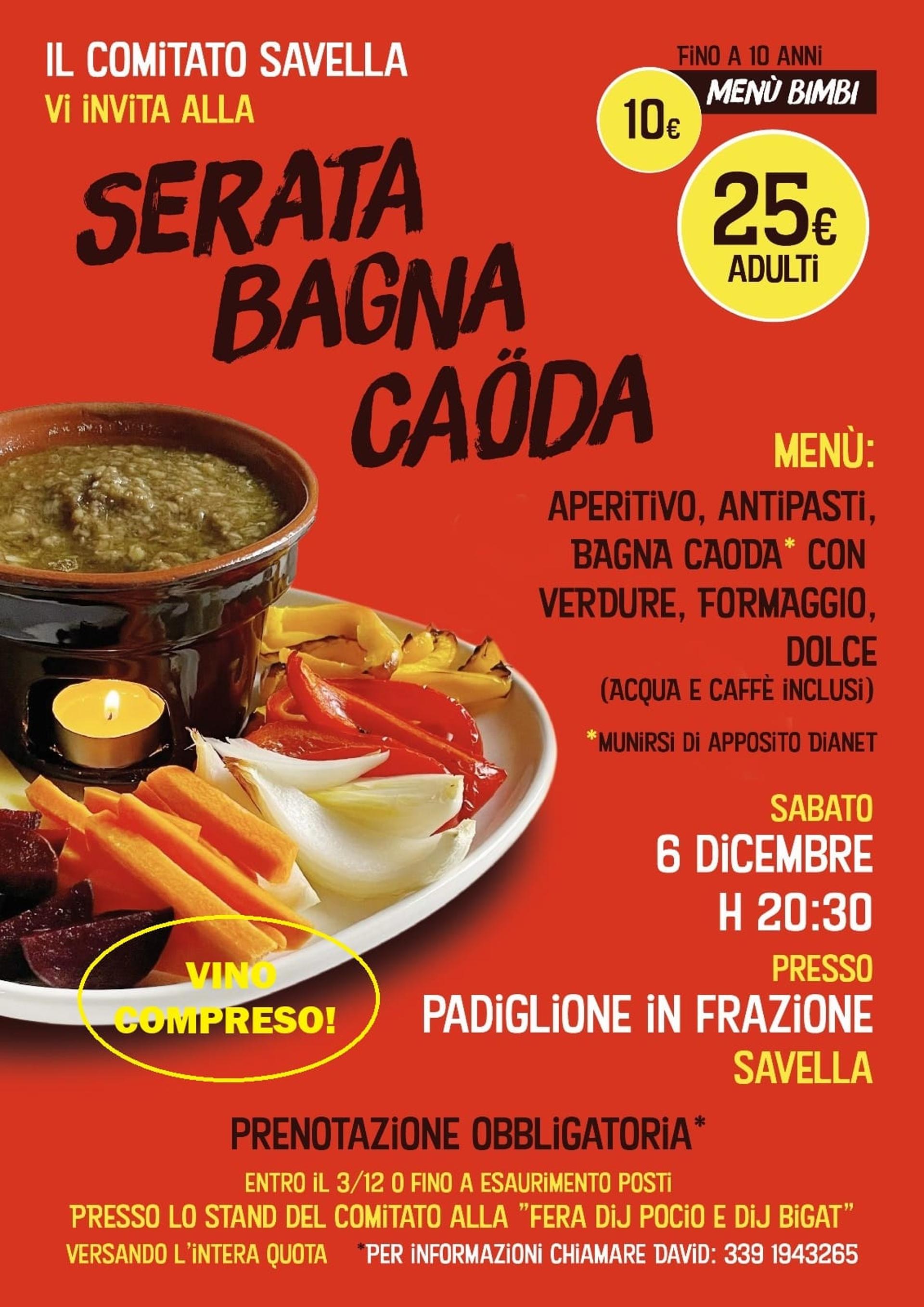 Il Comitato SAVELLA vi invita il 6 Dicembre alle ore 20:30 alla Serata BAGNA CAÖDA, presso il padiglione in frazione Savella! La prenotazione è obbligatoria entro il 3/12 fino ad esaurimento posti presso lo stand del comitato alla "Fera dij Pocio e dij Bigat",
