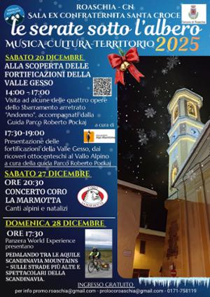 Tre serate natalizie a tema musica, cultura e territorio organizzate dalla Proloco di Roaschia nei giorni 20, 27 e 28 dicembre presso la sala dell'Ex Confraternita di Santa Croce.