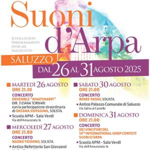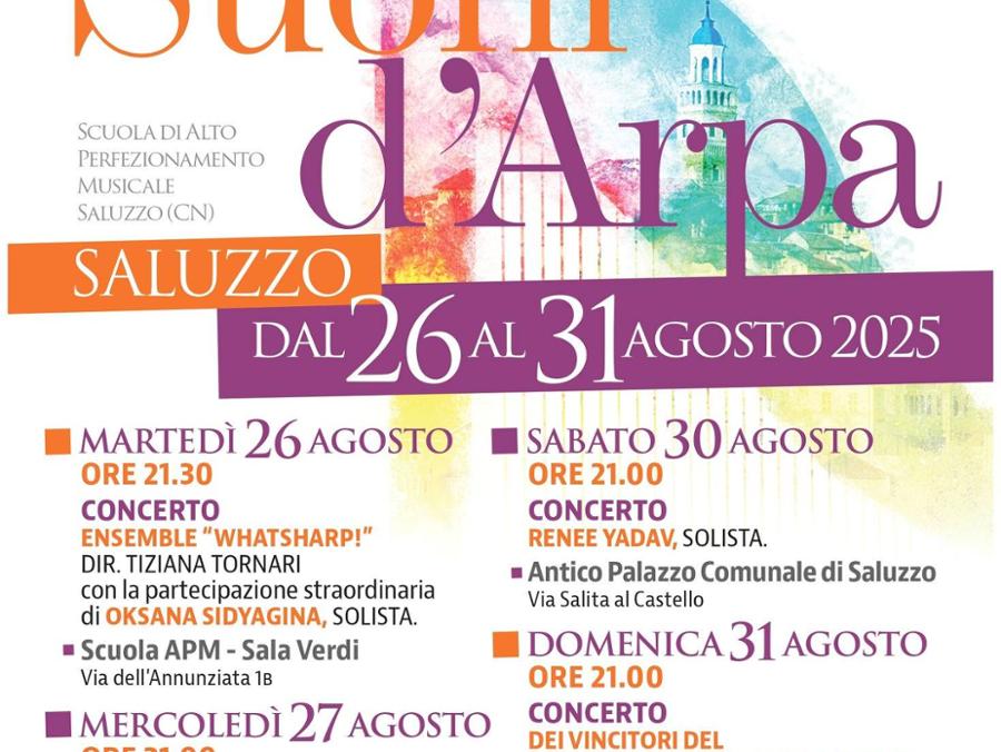 Da martedì 26 a domenica 31 agosto, a Saluzzo si terranno il Concorso e il Festival Internazionale "Suoni d'Arpa 2025" organizzati dalla Scuola APM e l'Associazione dell'Arpa. L'evento, a cui parteciperanno 62 giovani provenienti da tutto il mondo, ha come scopo quello di promuovere la musica italiana e sostenere i giovani talenti dell'arpa. Ingresso libero, gradita la prenotazione.