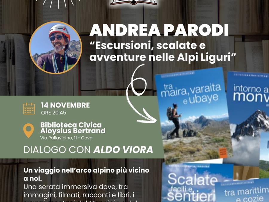 Venerdì 14 novembre, alle ore 20.45, la Biblioteca Civica Aloysius Bertrand di Ceva ospiterà l’autore e alpinista Andrea Parodi per una serata dal titolo “Escursioni, scalate e avventure nelle Alpi Liguri”, in dialogo con Aldo Viora.