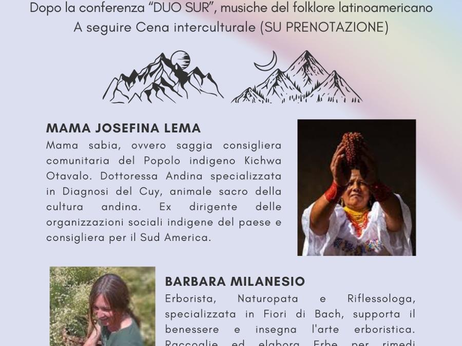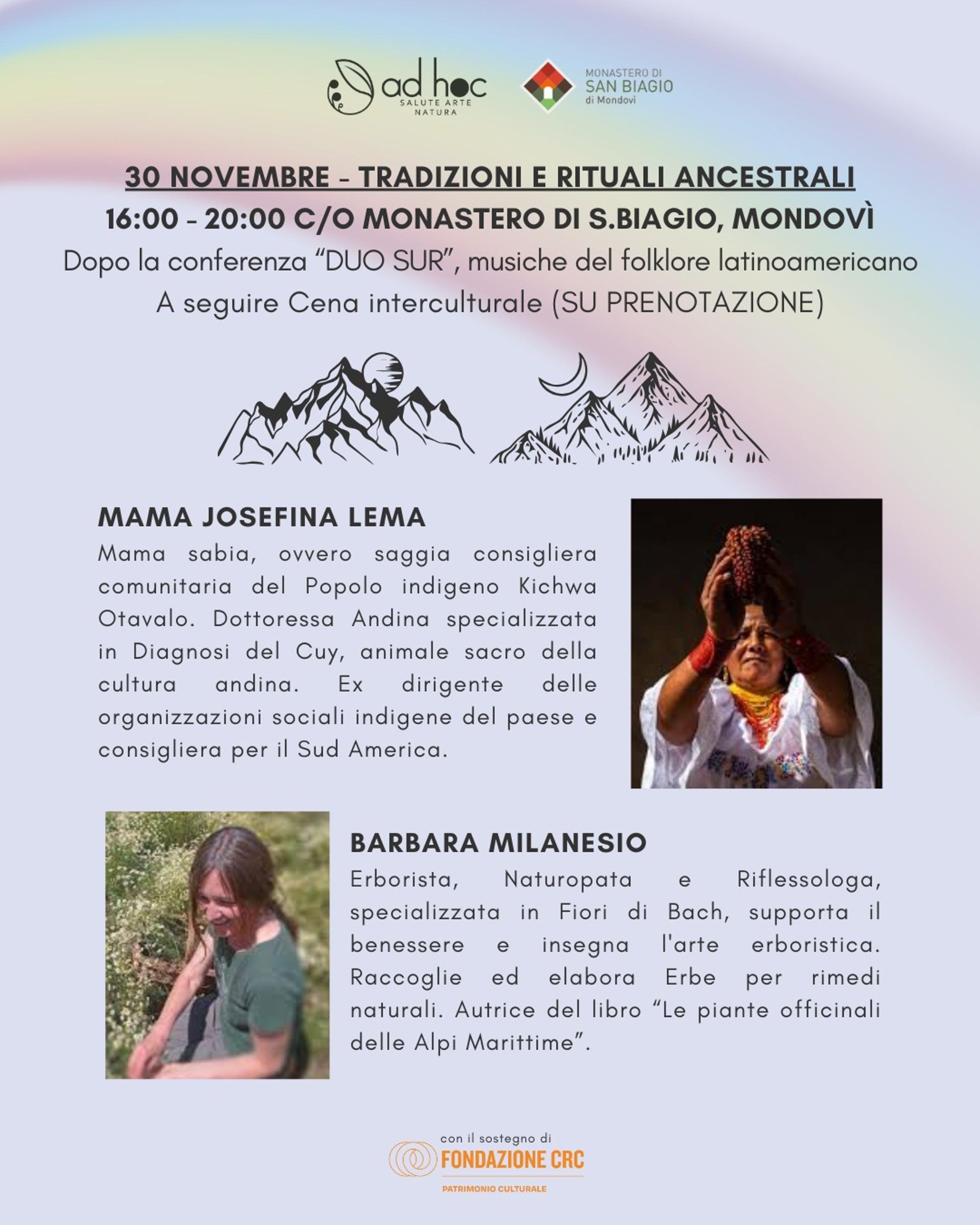 Domenica 30 novembre, dalle ore 16 alle ore 20 il Monastero di San Biagio di Mondovì ospita l'incontro "Tradizioni e rituali ancestrali" con Mama Josefina Lema (consigliera comunitaria del popolo indigeno Kichwa Otavalo) e Barbara Milanesio (erborista, naturopata e riflessologa). Dopo la conferenza musiche del folklore latinoamericano e cena interculturale (su prenotazione). Ingresso gratuito