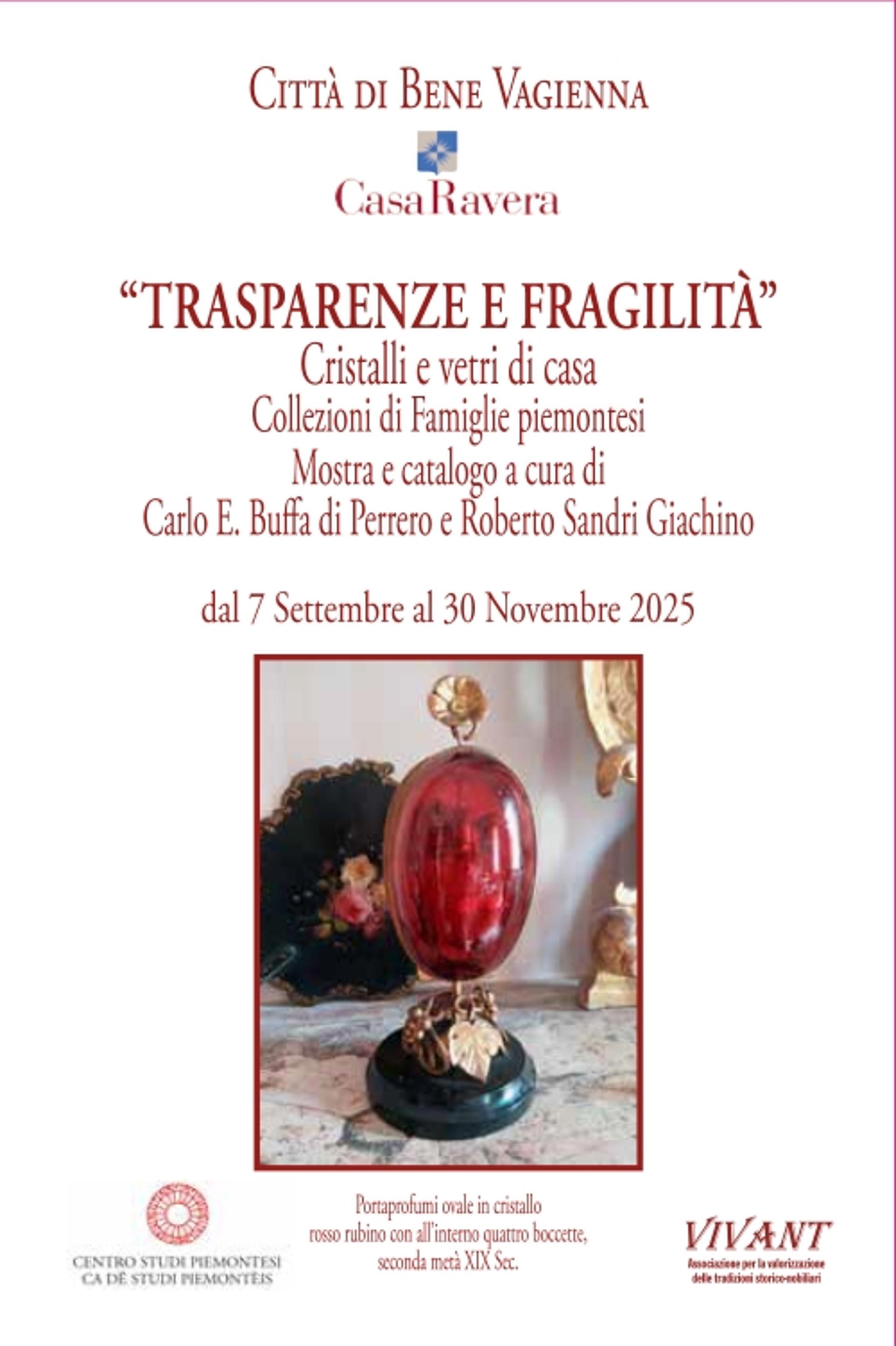 Dal 7 settembre al 30 novembre, Casa Ravera a Bene Vagienna ospita la mostra “Trasparenze e fragilità. Cristalli e vetri di casa”, dedicata a collezioni private di famiglie piemontesi. La mostra e il catalogo sono a cura di Carlo E. Buffa di Perrero e Roberto Sandri Giachino. L’inaugurazione è prevista per il 7 settembre alle ore 11.45. La mostra è visitabile nei giorni festivi con orario 10.00–12.00 e 15.00–18.00. Ingresso libero.