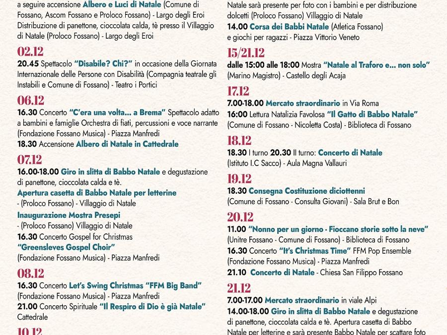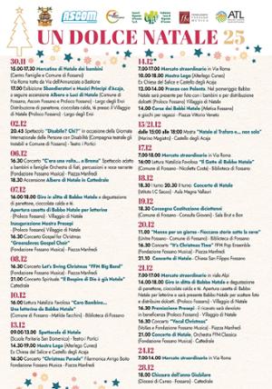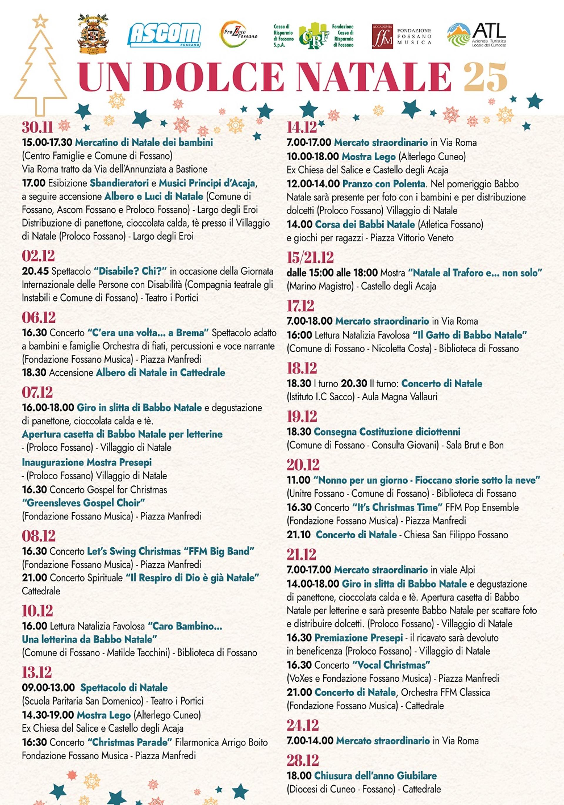 Un ricco programma di eventi natalizi nella Città degli Acaia. Dal 30 novembre al 28 dicembre il suggestivo centro storico di Fossano si anima grazie ai mercatini dei bambini, alle dolci degustazioni al Villaggio di Natale, ai mercati straordinari, spettacoli, concerti e mostre. Domenica 30 novembre alle ore 17.00 accensione Albero e luci di Natale con l'esibizione degli Sbandieratori e Musici dei Principi d'Acaia.
